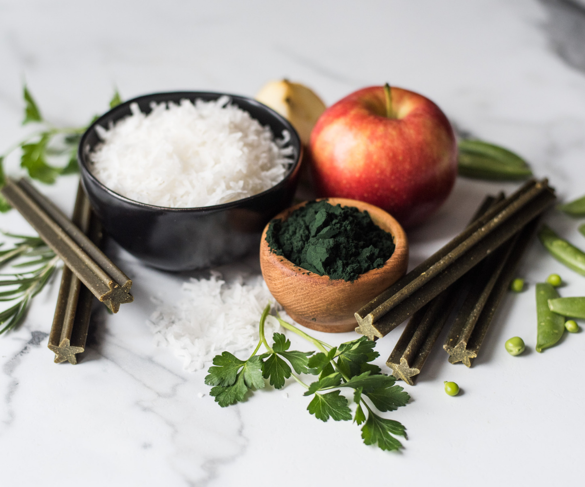 Ingredients: Chickpea, Tapioca Flour, Coconut Glycerin, Apple Pomace Powder, Pea Fiber, Brewers Yeast, Salt, Turmeric, Organic Spirulina, Parsley, Lactic Acid, Peppermint Oil, Citric Acid, Mixed Tocopherols, Rosemary