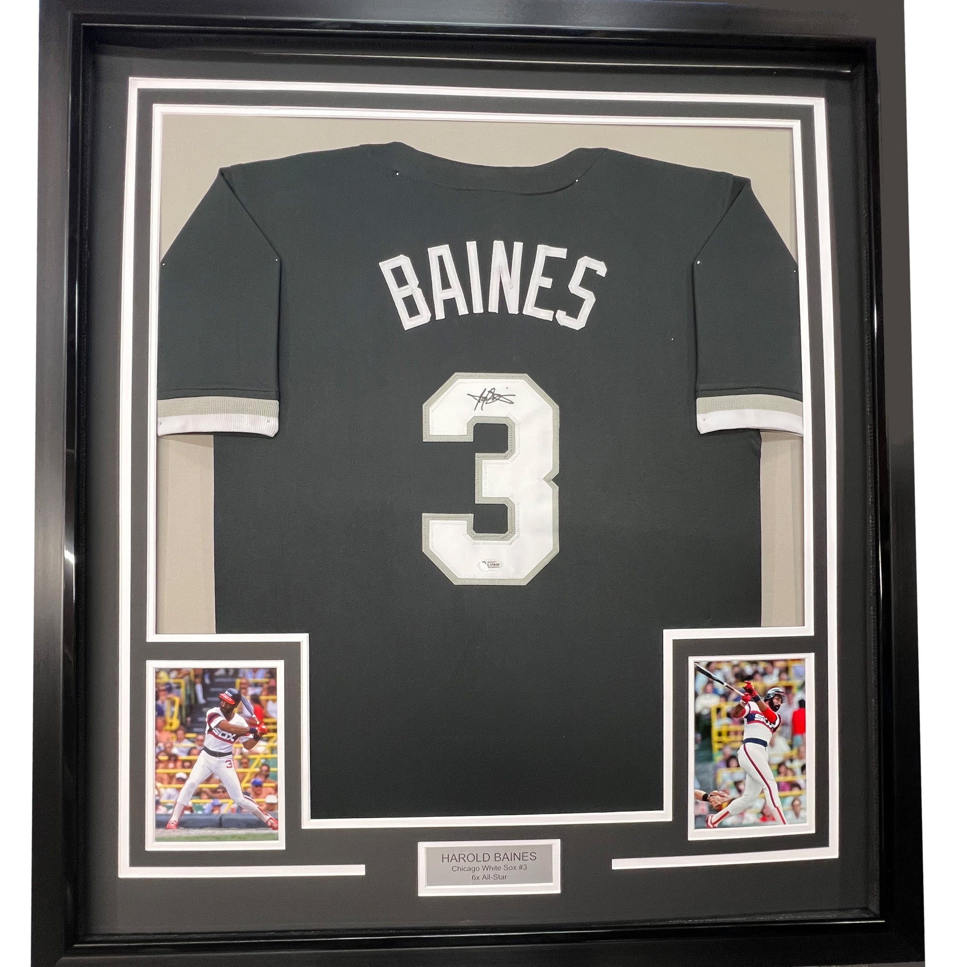 Framed Autographed/Signed Harold Baines 35x39 Chicago Black Baseball Jersey Beckett BAS COA