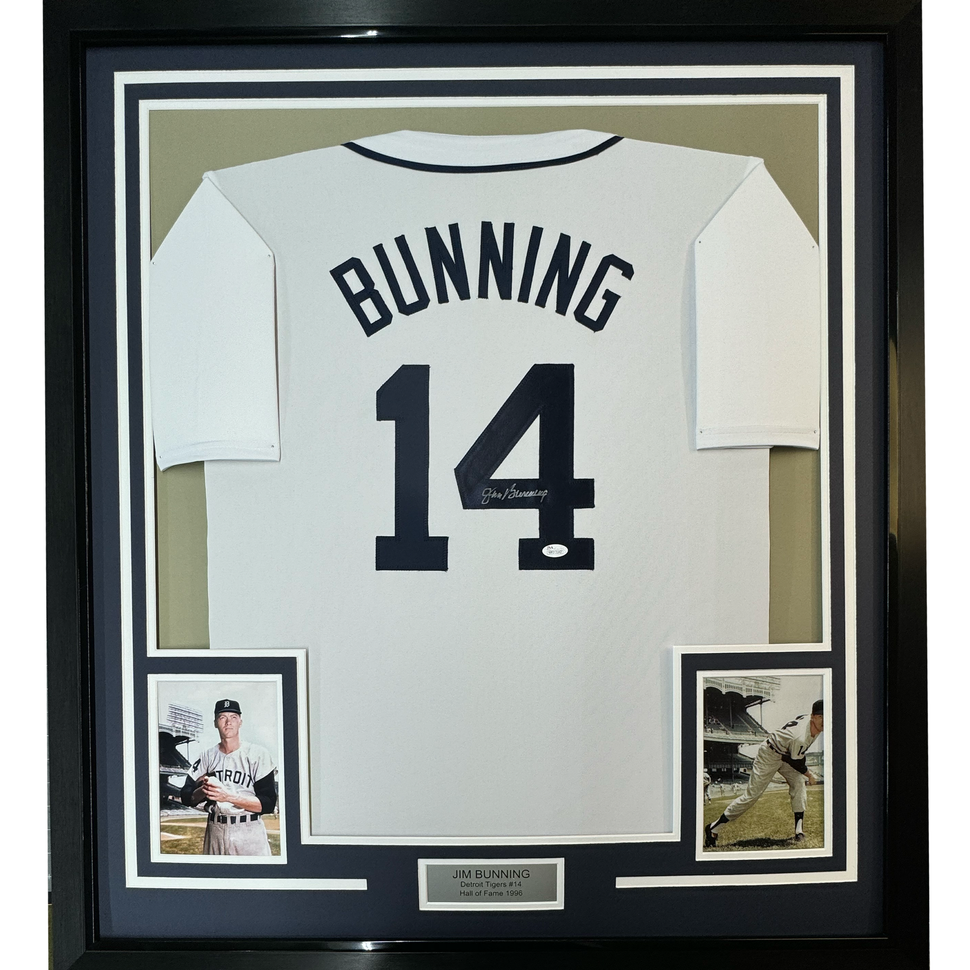 Framed Autographed/Signed Jim Bunning 35x39 Detroit White Baseball Jersey JSA COA