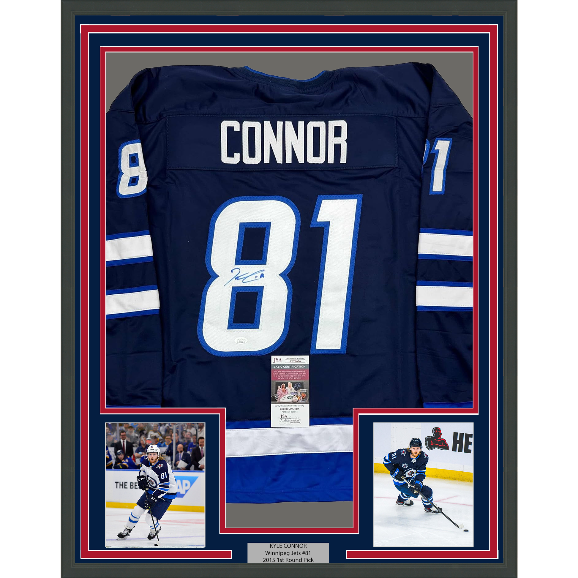 Framed Autographed/Signed Kyle Connor 35x39 Winnipeg Blue Hockey Jersey JSA COA