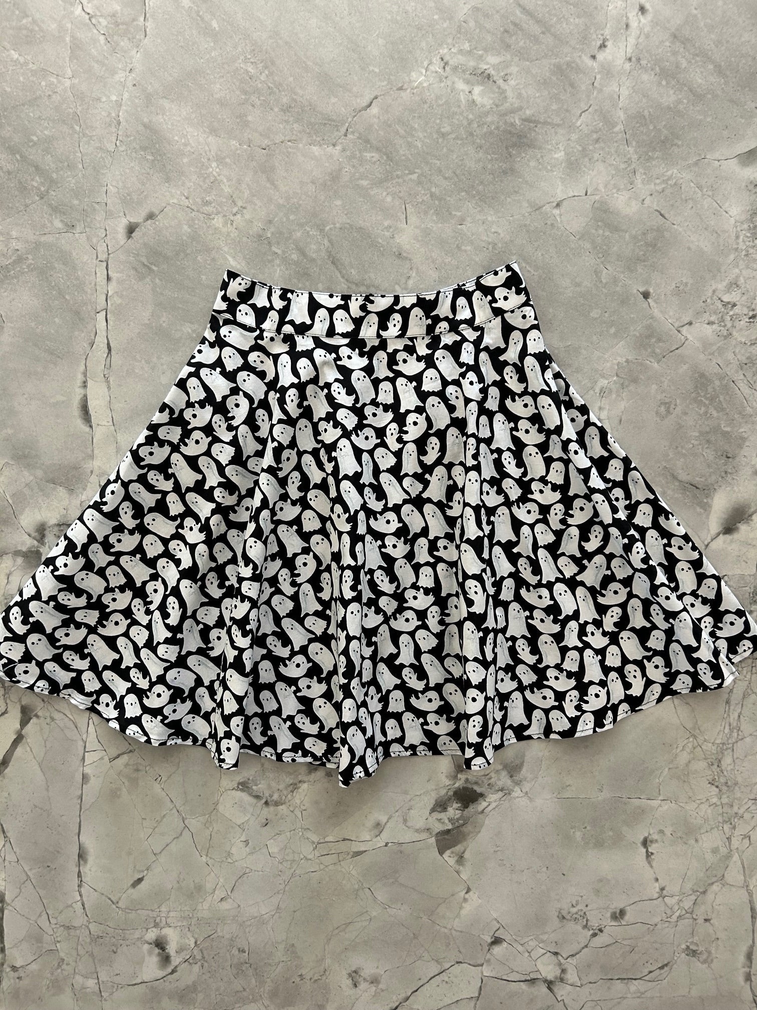 The ultimate fun and flirty skirt! Shown in our Ghost print, this vintage style skirt features an elasticized back waist for ease of wear and a back zippered closure.