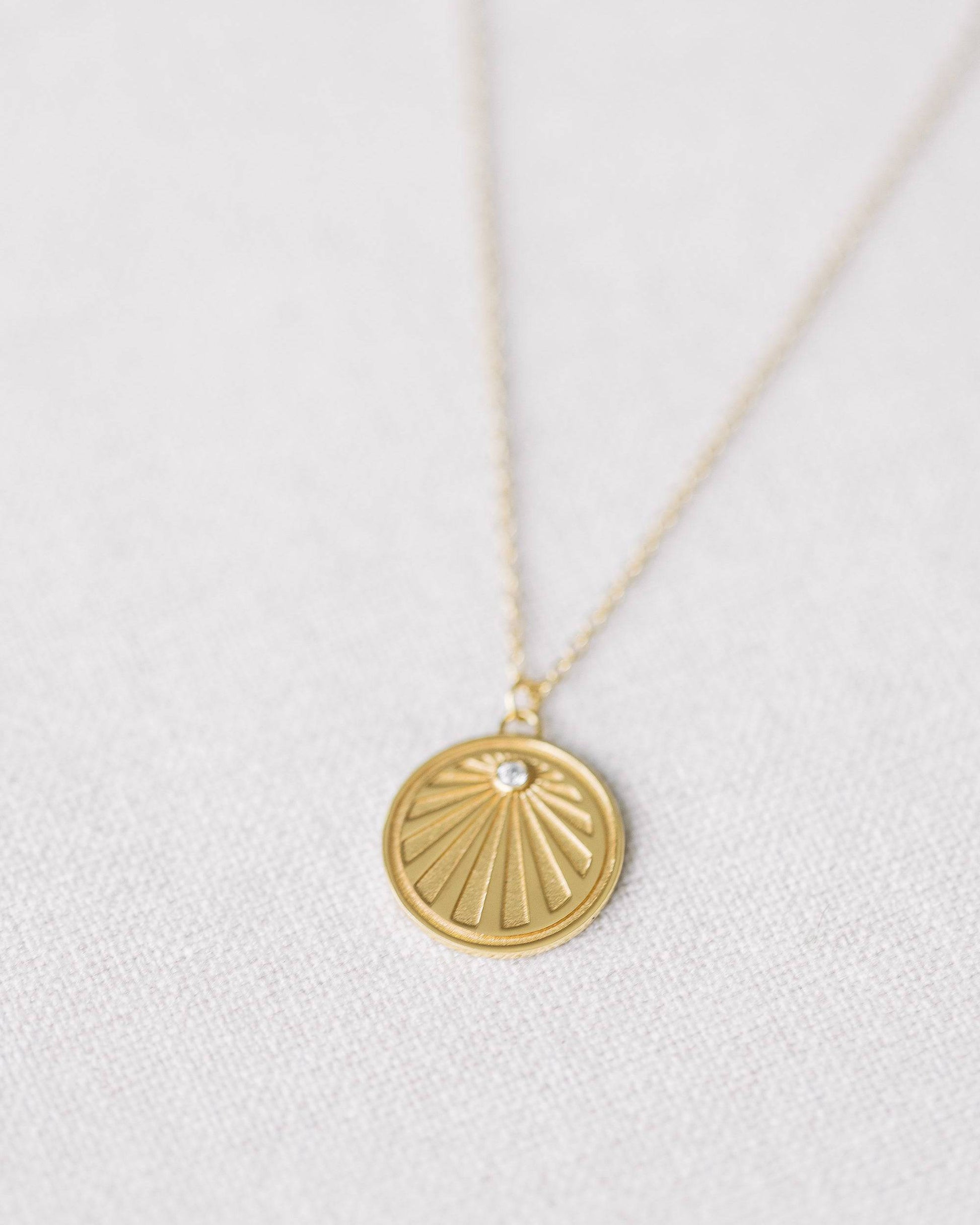 This beautiful Gold Crystal Sunray necklace is crafted with gold vermeil, featuring a radiant sunray medallion.