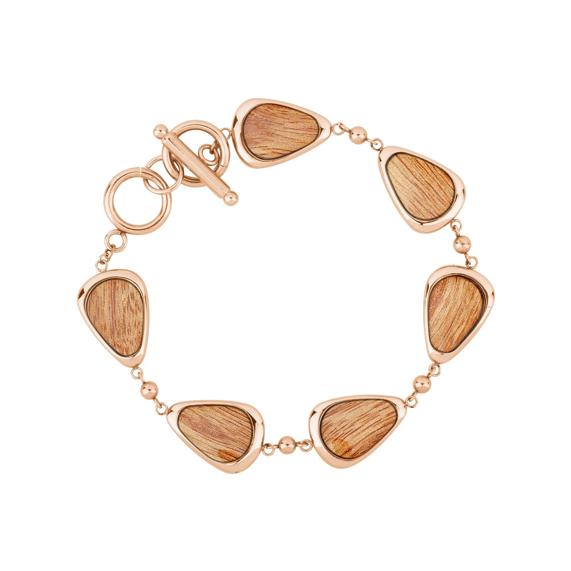 Rose Gold plated stainless steel water drop link bracelet with Gum Burl (Tasmanian Oak/Stringybark) wood inlays. Adjustable toggle and loop closure.