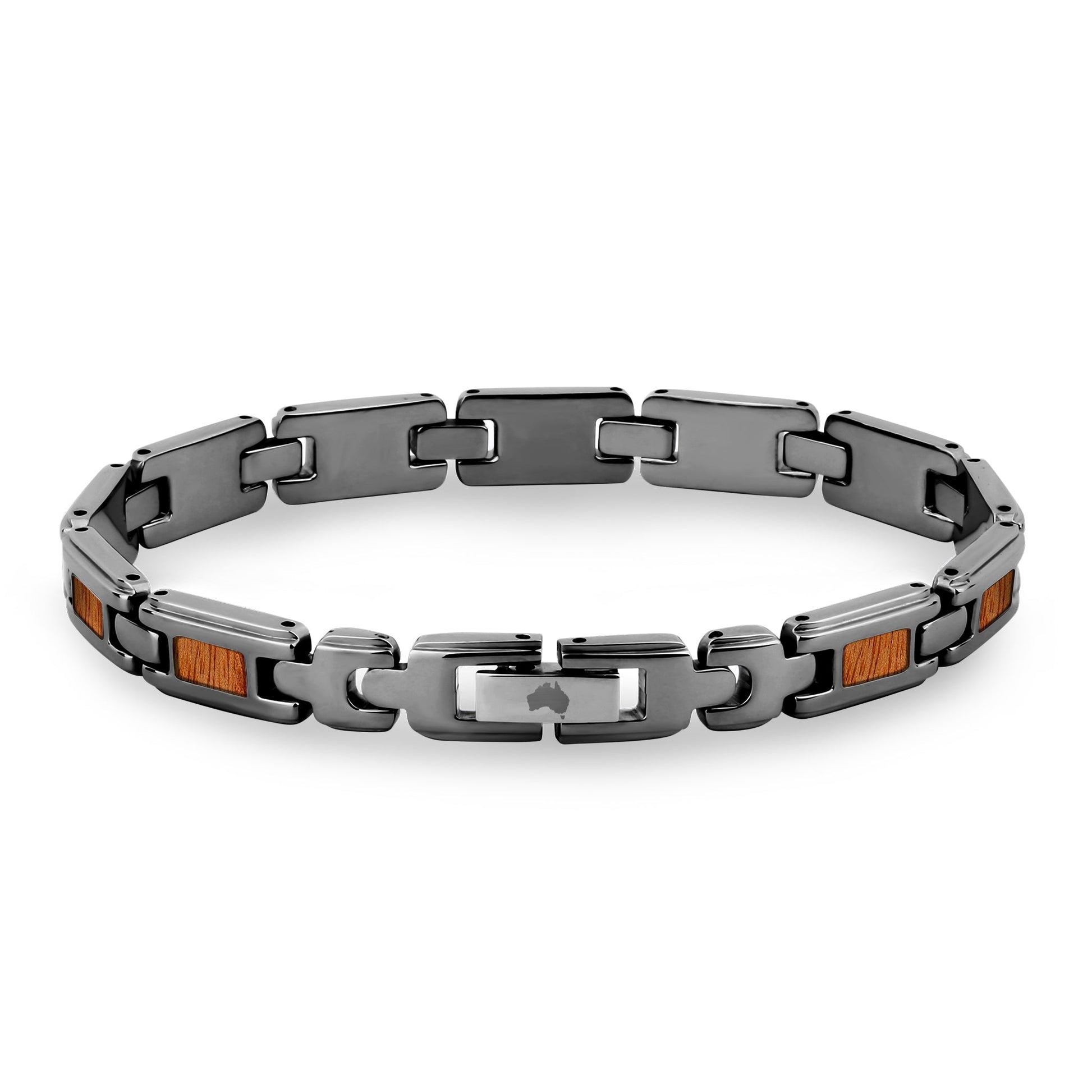 Ladies Gunmetal plated stainless steel link bracelet with Australian Gum Burl (Tasmanian Oak/Stringybark) inlays. Links are removable to adjust for size.