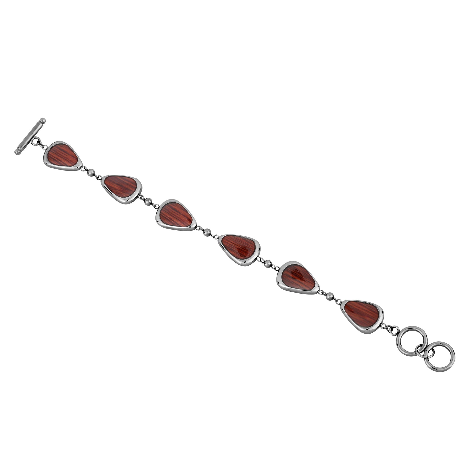 Gunmetal plated stainless steel water drop link bracelet with Jarrah wood inlays. Adjustable toggle and loop closure.