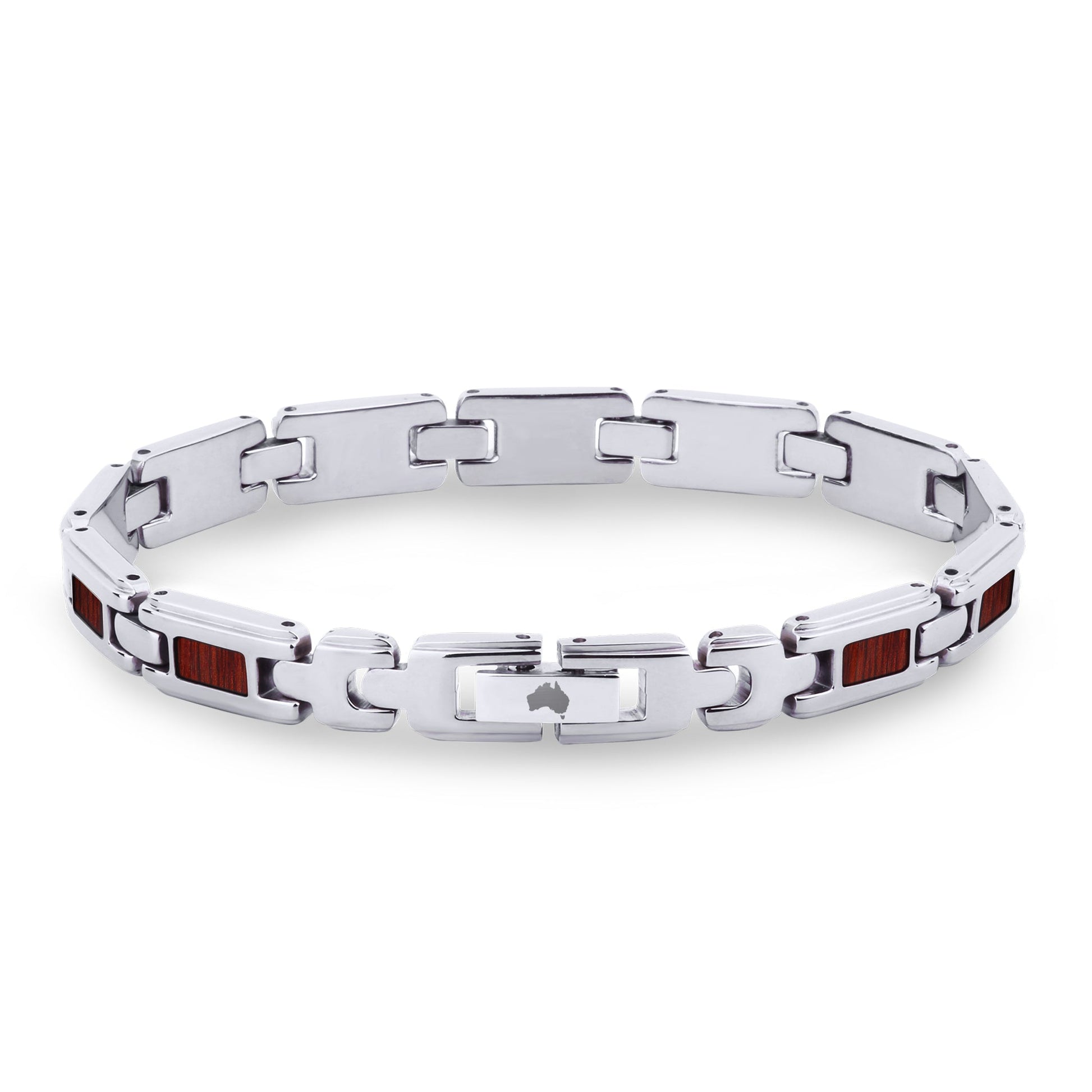 Ladies stainless steel link bracelet with Australian Jarrah wood inlays. Links are removable to adjust for size.