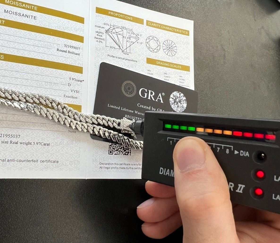 - 4.96 or 5.97 carat moissanite stones passes diamond tester.