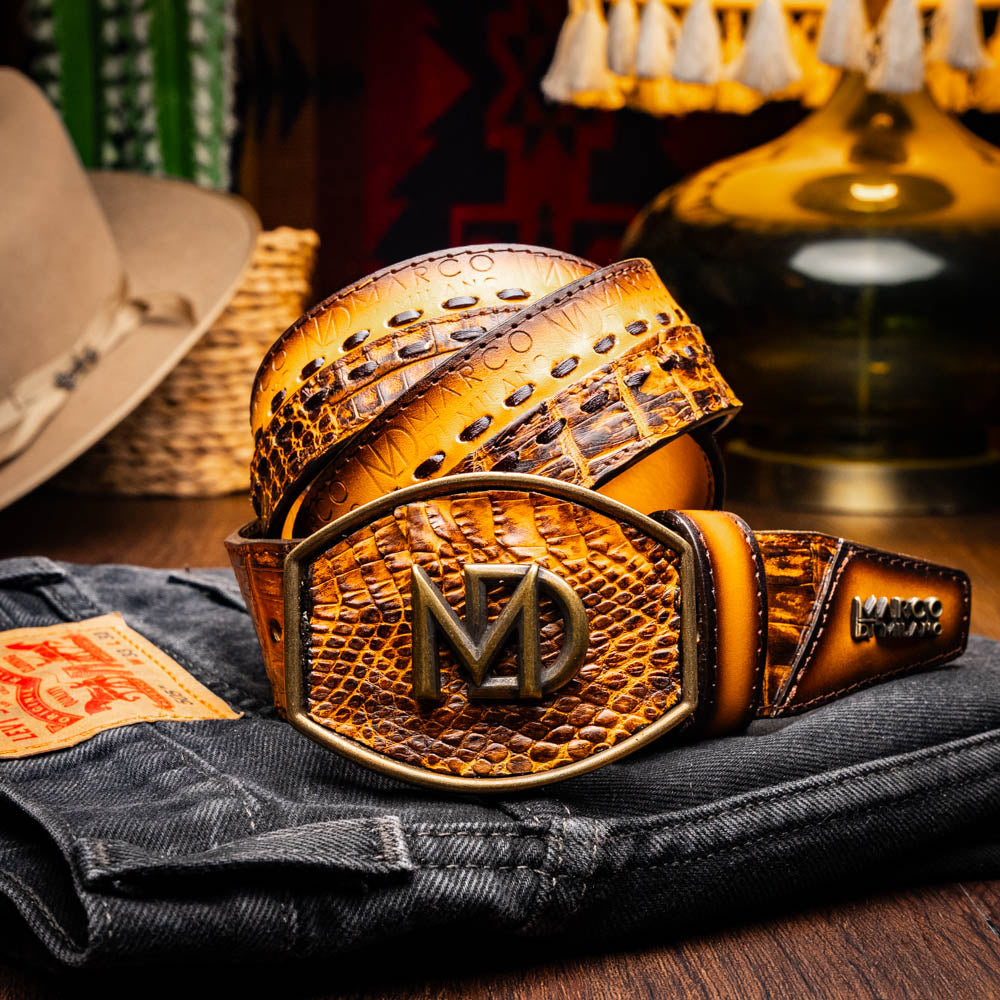 The MONTANA belt channels classic Western spirit through a bold, handcrafted lens. Made from genuine caiman crocodile skin and overlaid with rich full-grain calf leather, it features the distinctive Marco Di Milano brand stamp across the outer panel and a custom center-stitched leather channel—a nod to traditional saddlework that adds both texture and character.