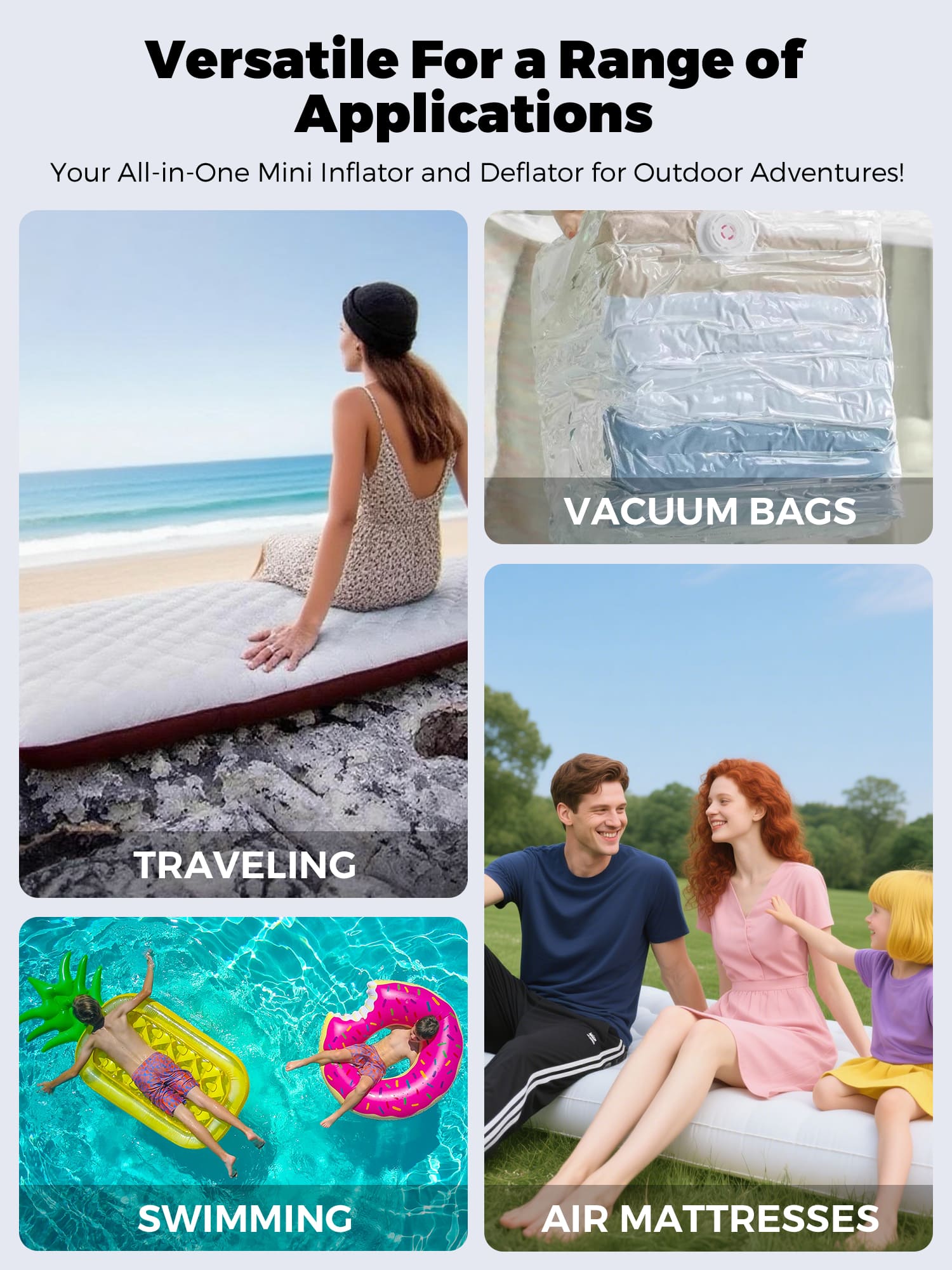 Comes with five different nozzles, making it compatible with most inflatables—from air mattresses and pool floats to vacuum storage bags, inflatable furniture, and toys. Perfect for camping, road trips, beach days, or backyard fun.