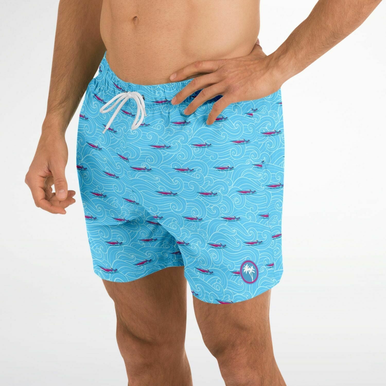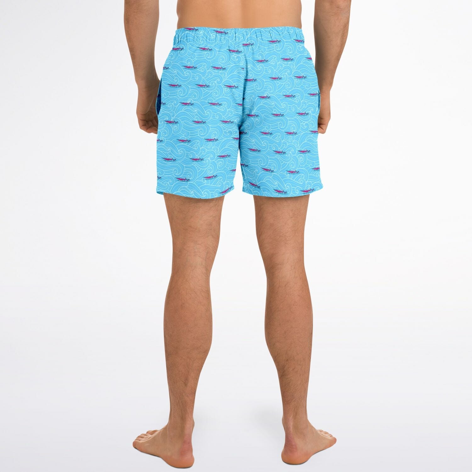 Look and stay cool with these shorter-length swim trunks that hit above the knee. They come in a fast-dry fabric, and feature a drawstring waistband, mesh basket lining and mesh-lined side pockets.