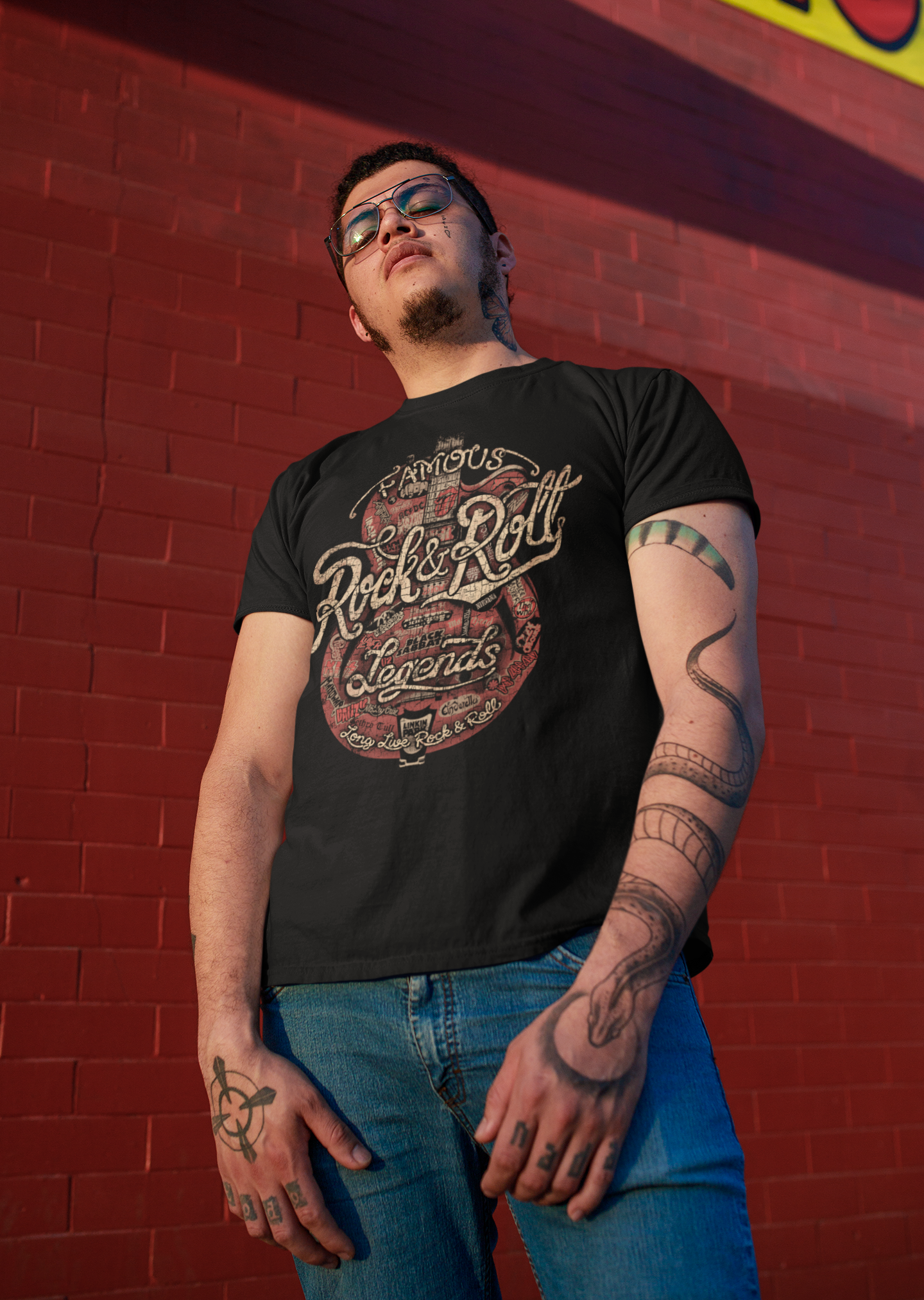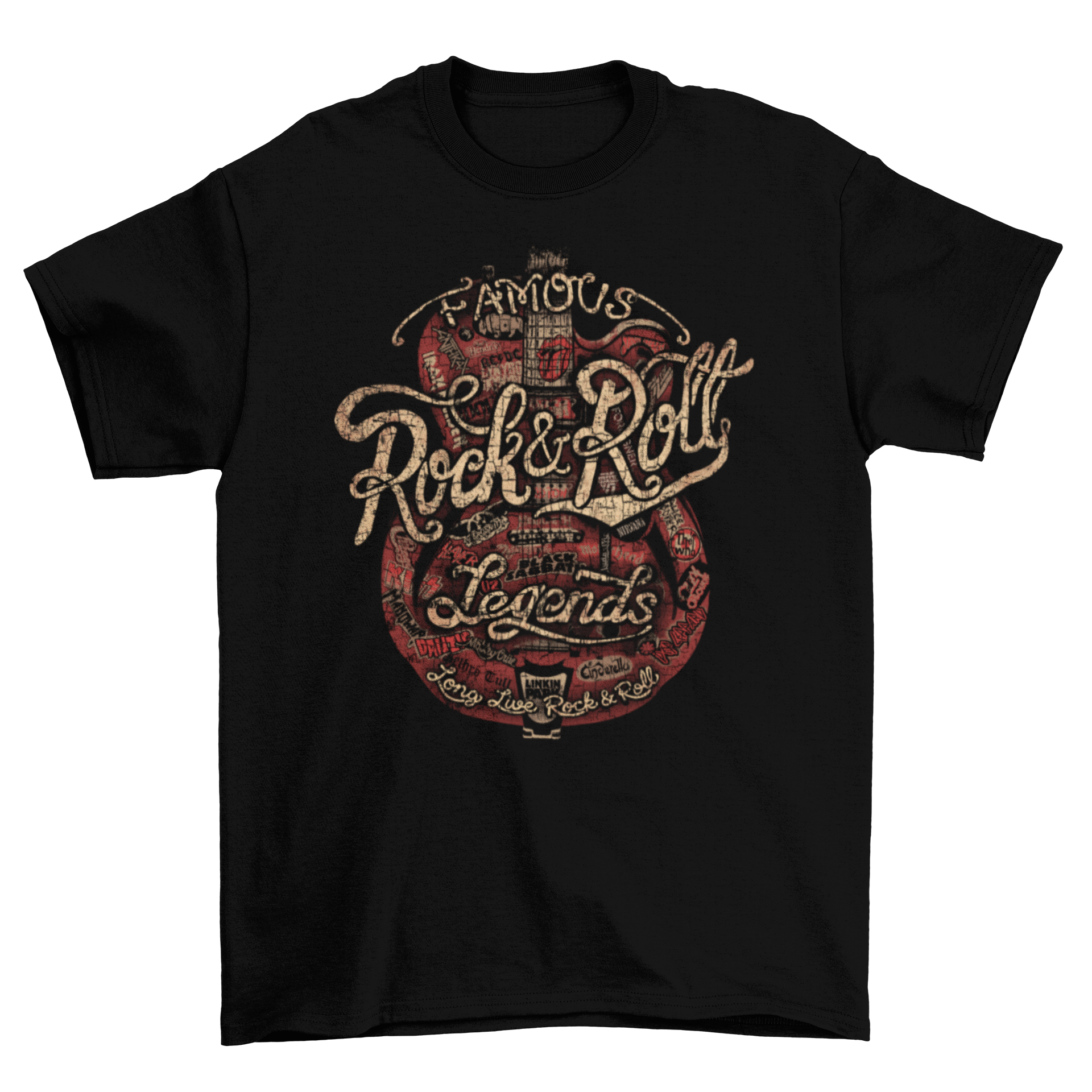 Unleash your passion for rock and roll with TABOO's "Rock & Roll Legends Script" T-Shirt. This unique shirt combines an eye-catching distressed guitar illustration plastered with iconic, unidentified band logos, exuding a classic and vintage appeal. It's a stylish expression of your appreciation for the history and legends of rock music.