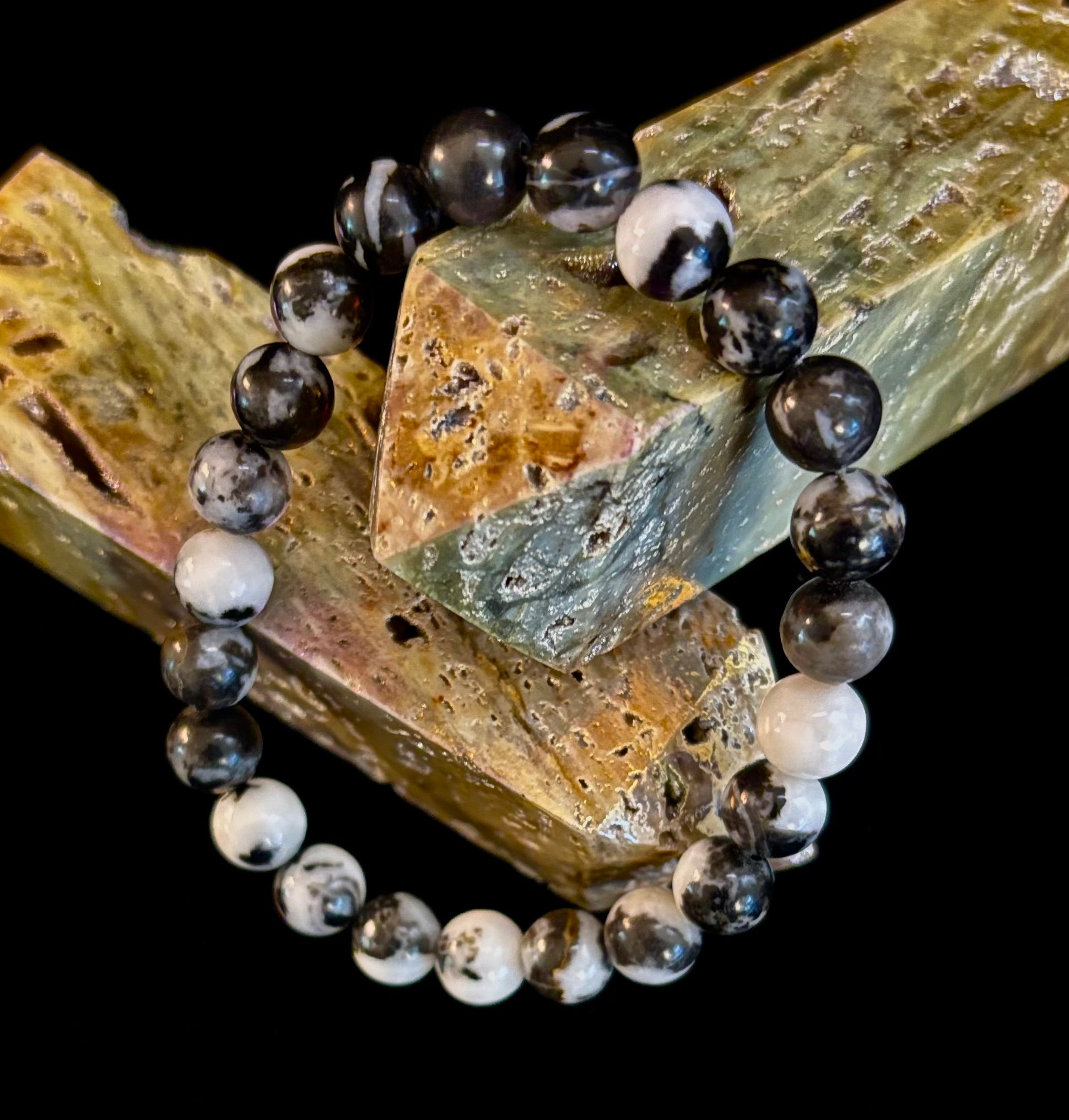 Make a bold statement with our Zebra Stone Bracelet, featuring polished 8mm beads in striking black-and-white patterns that resemble the natural beauty of a zebra’s stripes. Unique and eye-catching, each bead is a reminder of balance—the harmony of opposites coming together in perfect unity.