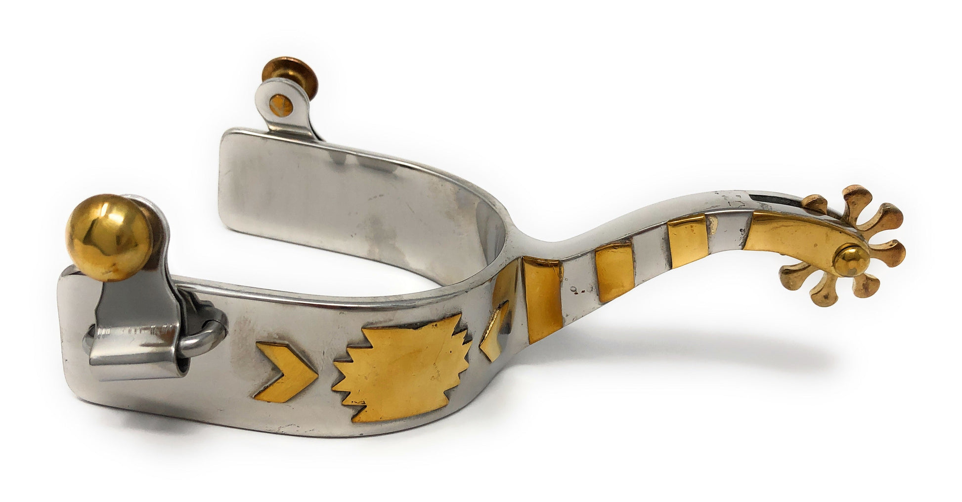 AJ Tack Men's Stainless Steel Offset Southwest Spurs are expertly crafted for both function and style. Featuring a brass southwestern and arrows motif, these spurs offer a distinctive look that embodies western heritage. The brass bars on the shank, along with brass buttons and brass rowels, provide durability and a refined touch. Designed for comfort and precision, these spurs are perfect for riders who appreciate quality craftsmanship.