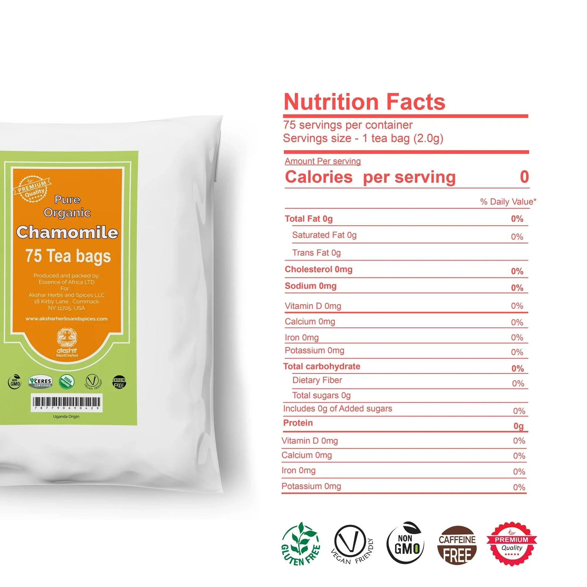 Chamomile is are cultivated in the pristine fields of Uganda using farming methods, free from pesticides or preservatives. Handpicked chamomile flowers are carefully dried and packed to preserve their natural purity, ensuring a wholesome and refreshing tea experience, straight from farm to cup.
