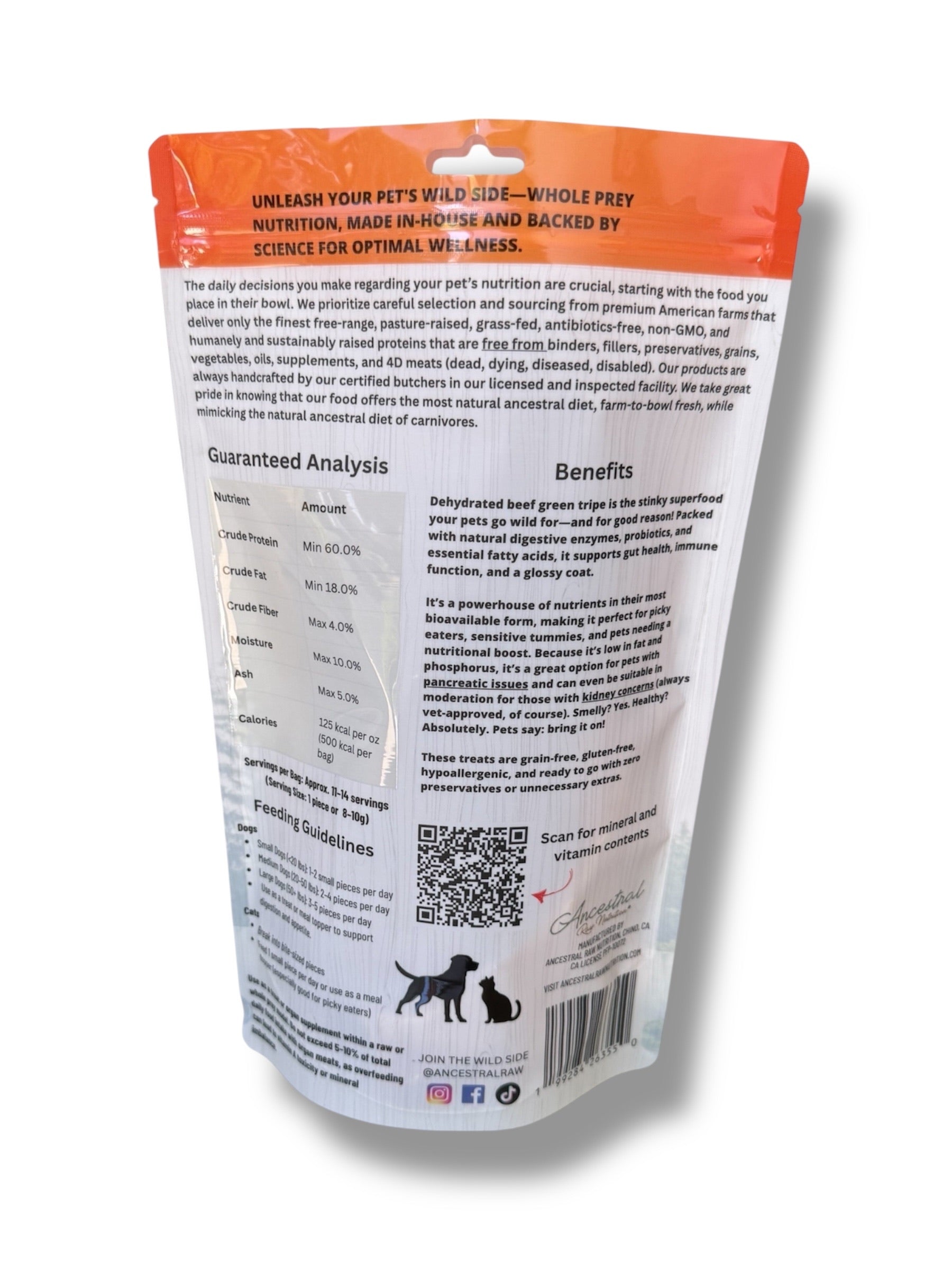 Indulge your pup's chewing desires with our Dehydrated Beef Green Tripe sticks! Not only do they provide a healthy outlet for energy and discourage destructive behavior, but they also support dental health by naturally cleaning teeth and releasing dopamine for a calmer, happier dog. Say goodbye to plaque and stress with these delicious chews!