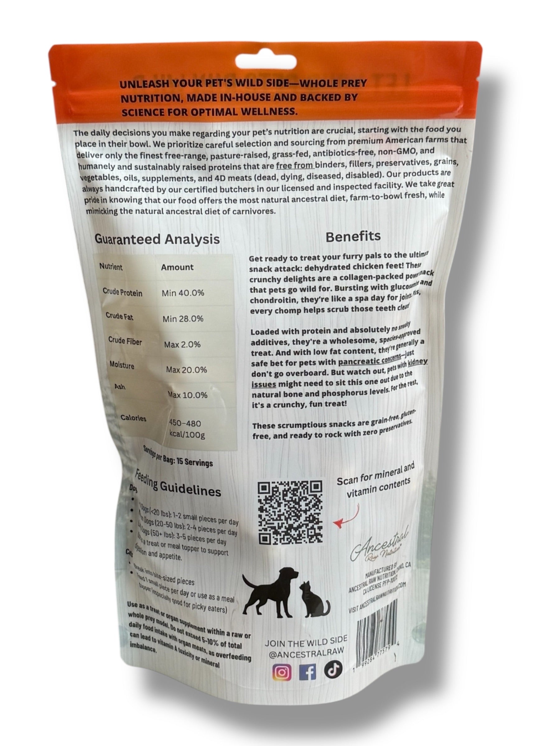 Dehydrated chicken feet are a natural source of glucosamine and chondroitin, which are essential for the building of healthy connective tissue.