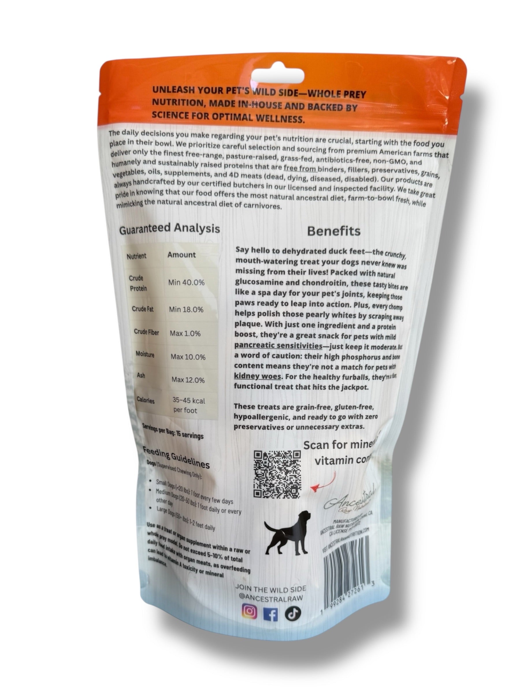 Duck feet are naturally rich in collagen, glucosamine, and chondroitin, which help support hip and joint health. They also help aid in dental hygiene.