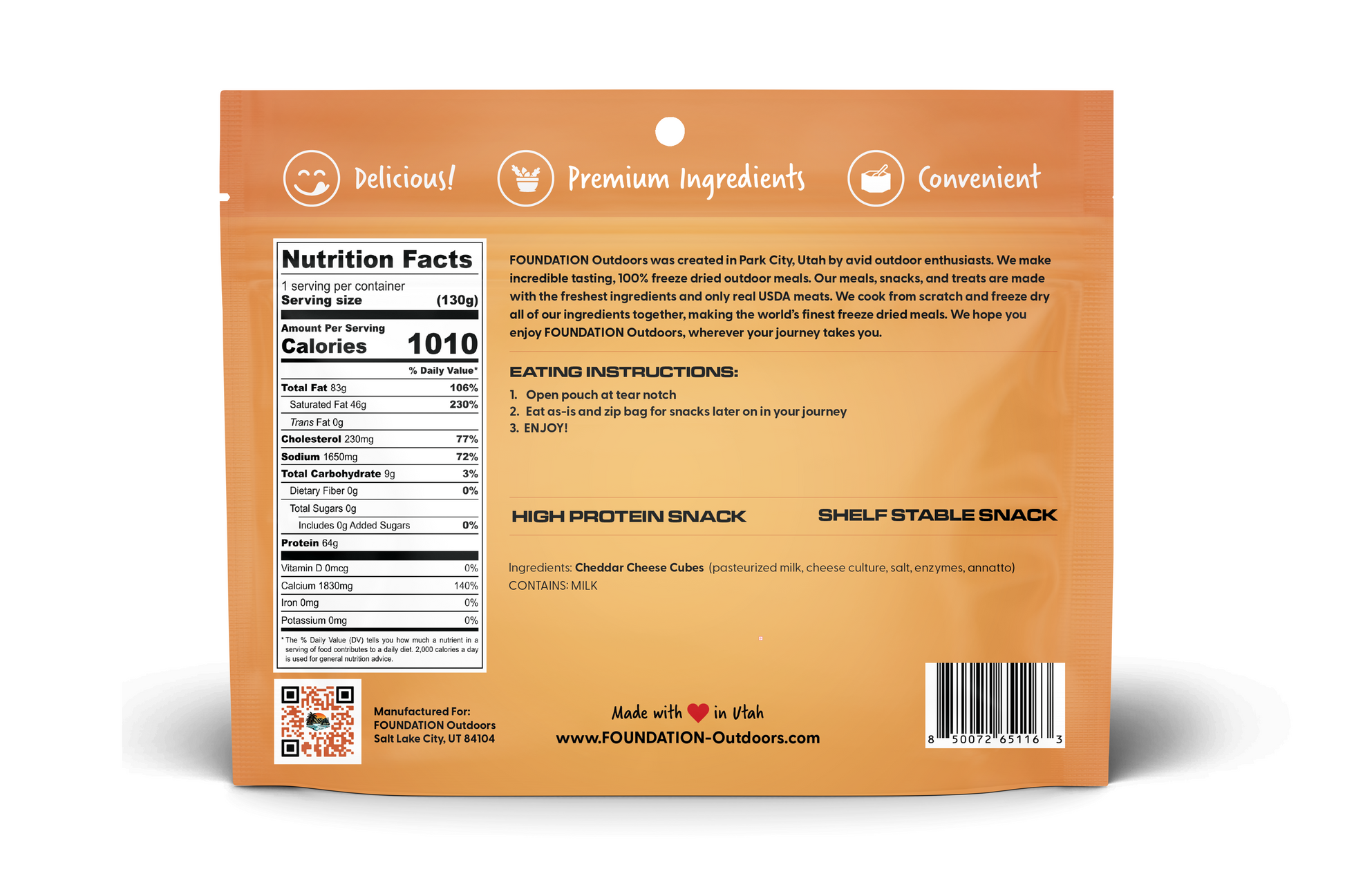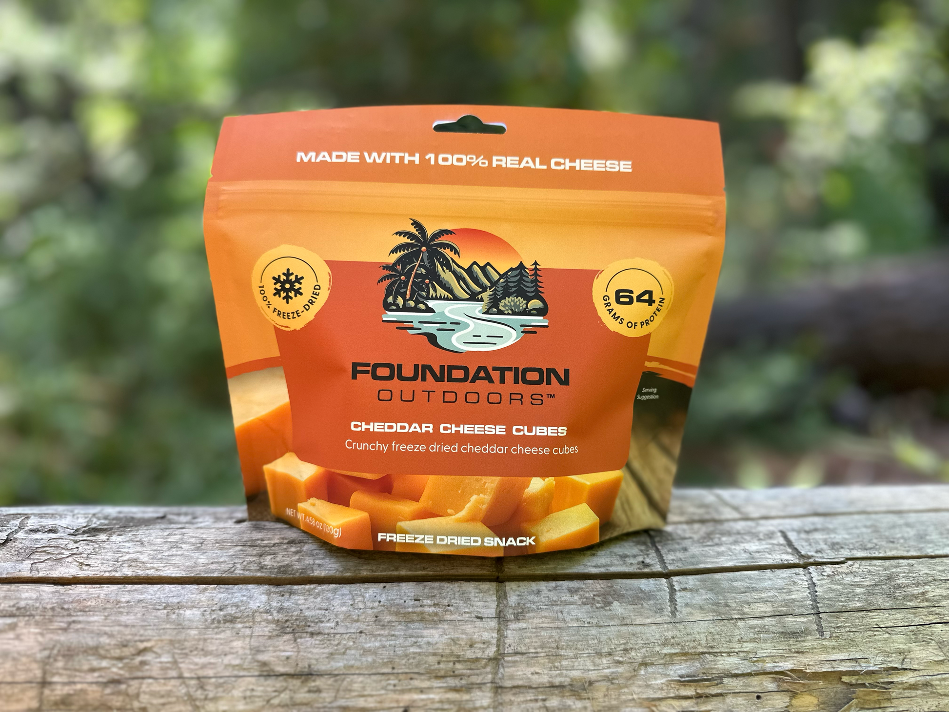 FOUNDATION Outdoors ready-to-eat cheddar cheese bites are the perfect snack for on the road, and on the trail. Eat as-is, right out of the bag! This high protein crunchy treat will be your go-to snack for all of your adventures!