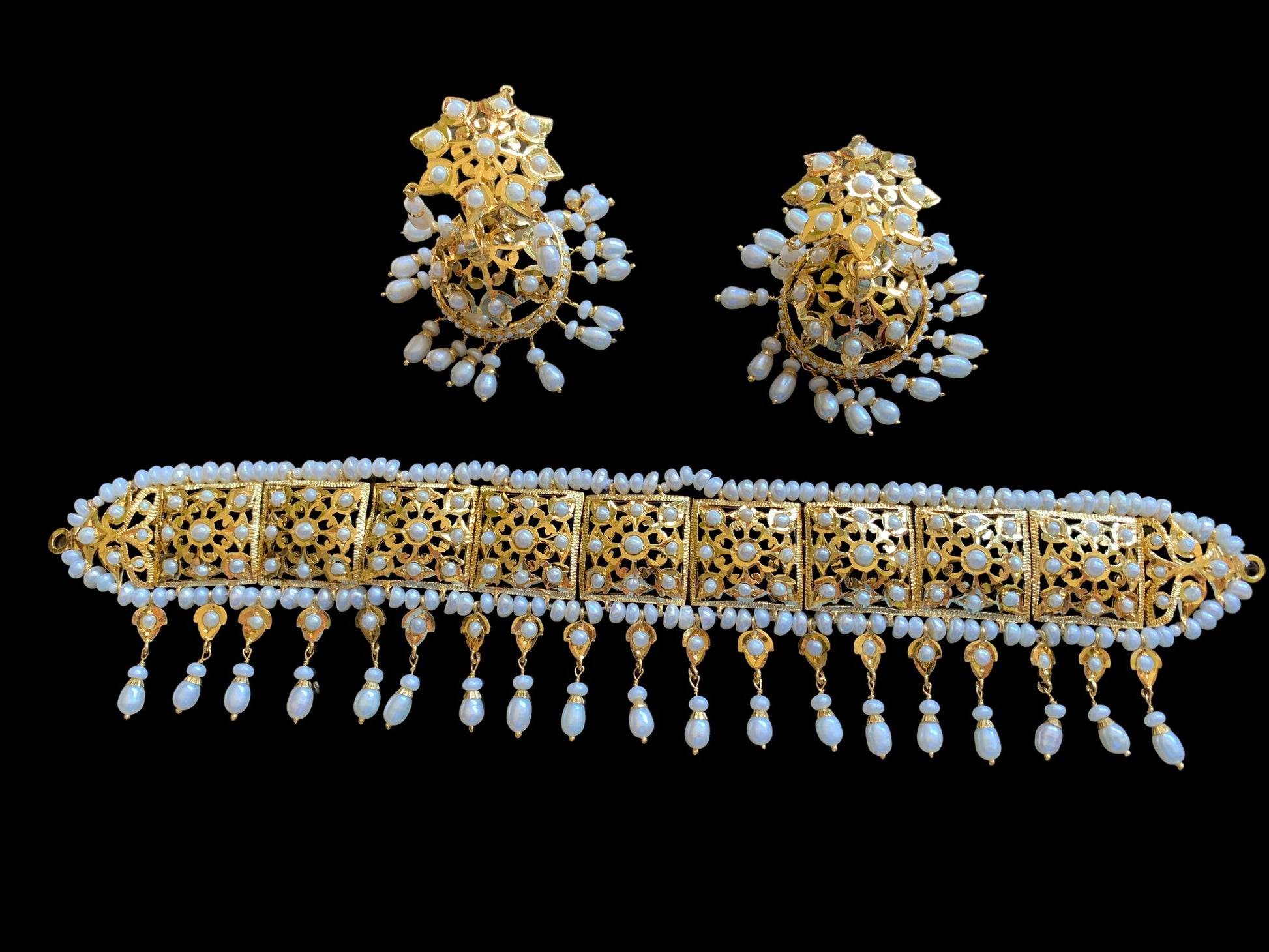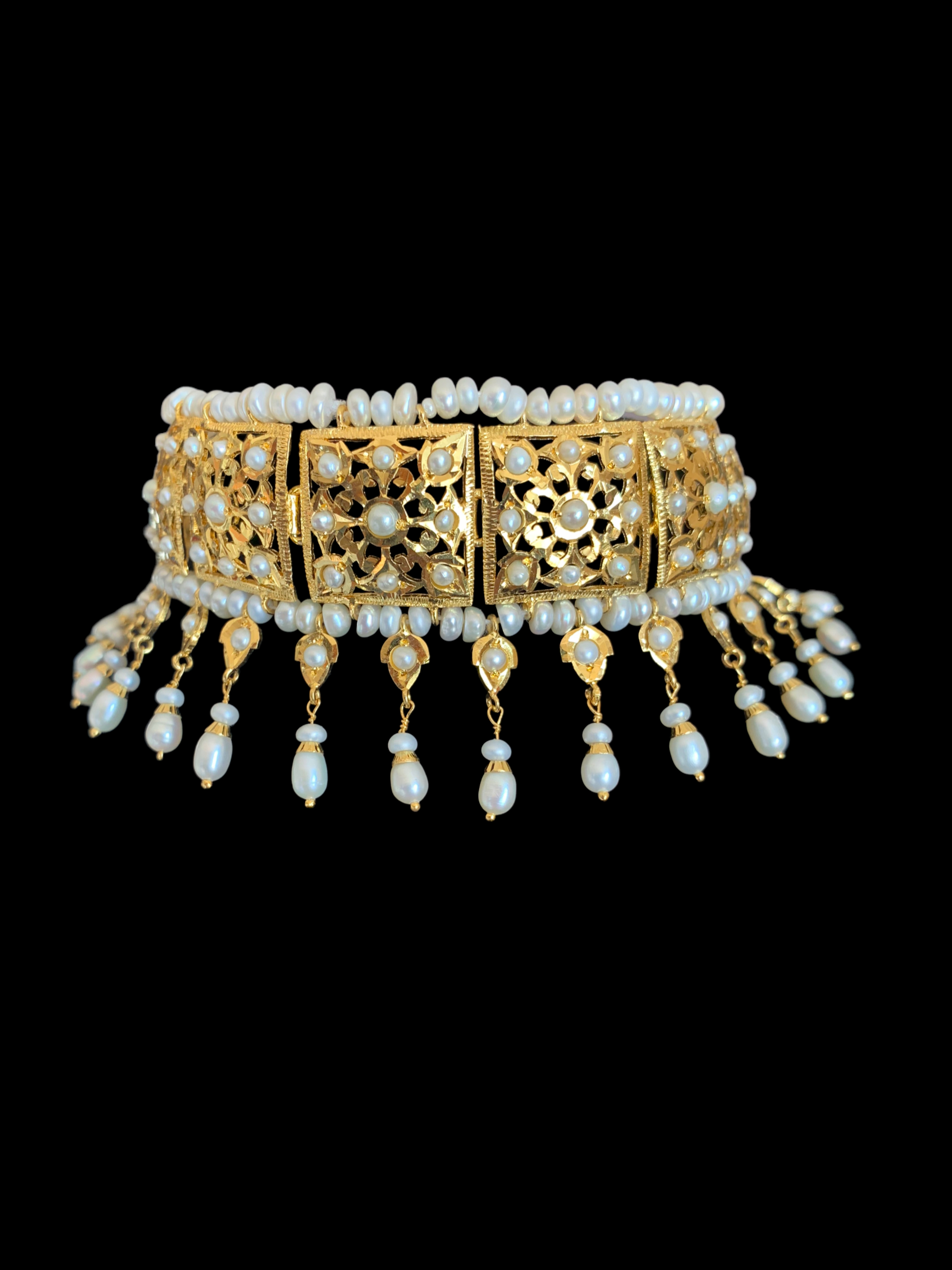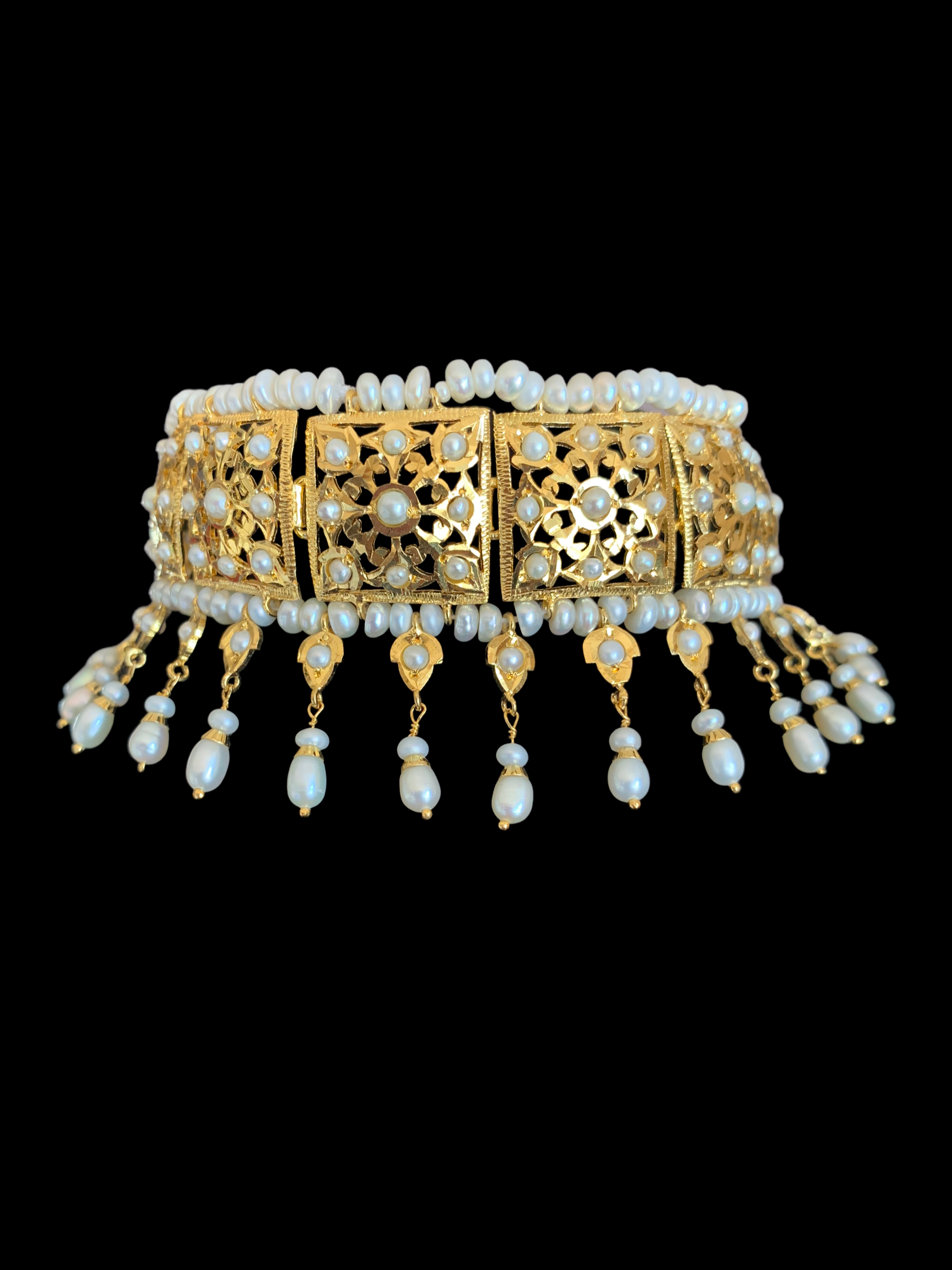 Gold plated silver jadavi choker with jhumka in fresh water pearls ( SHIPS IN 5 WEEKS )