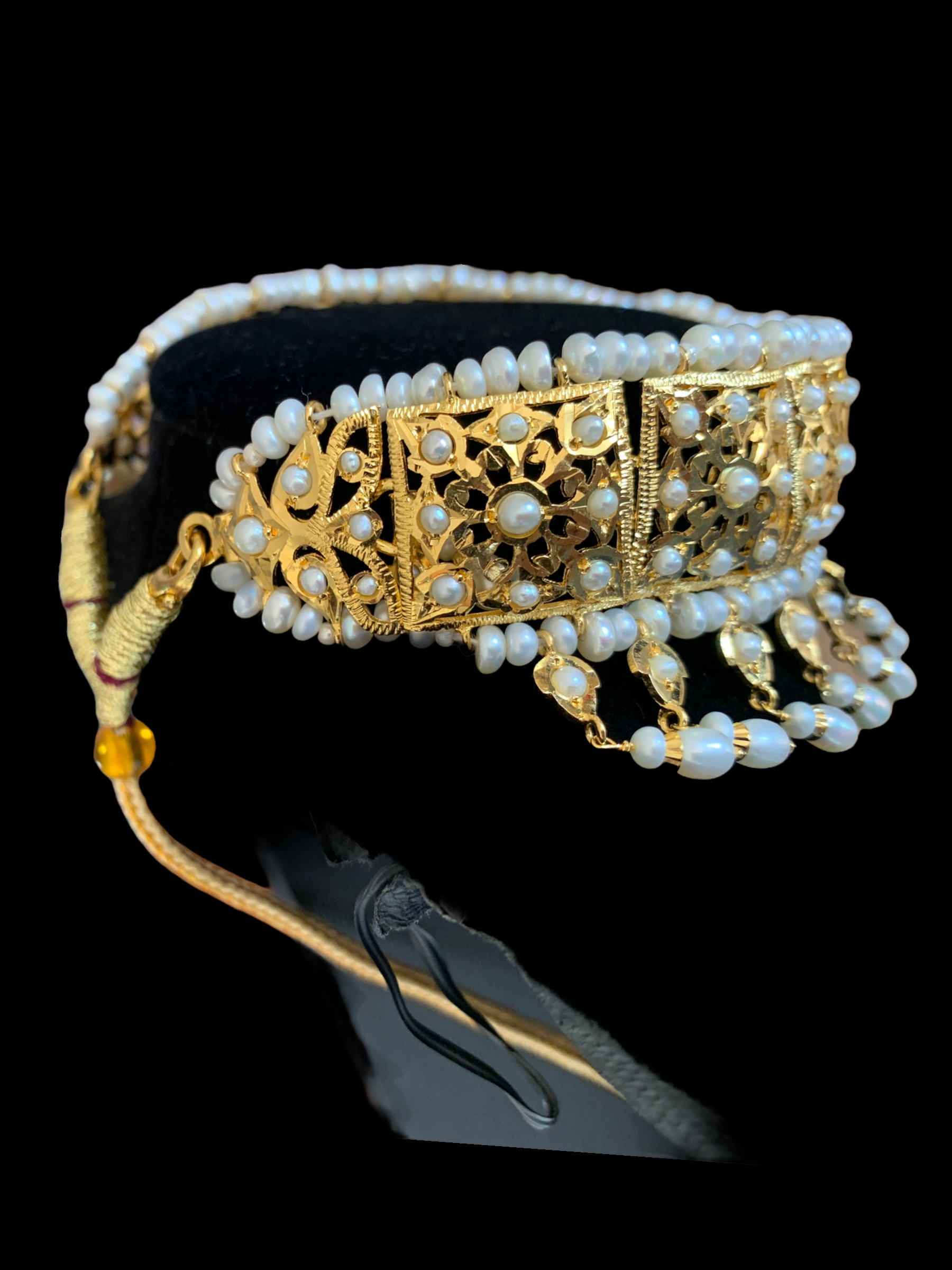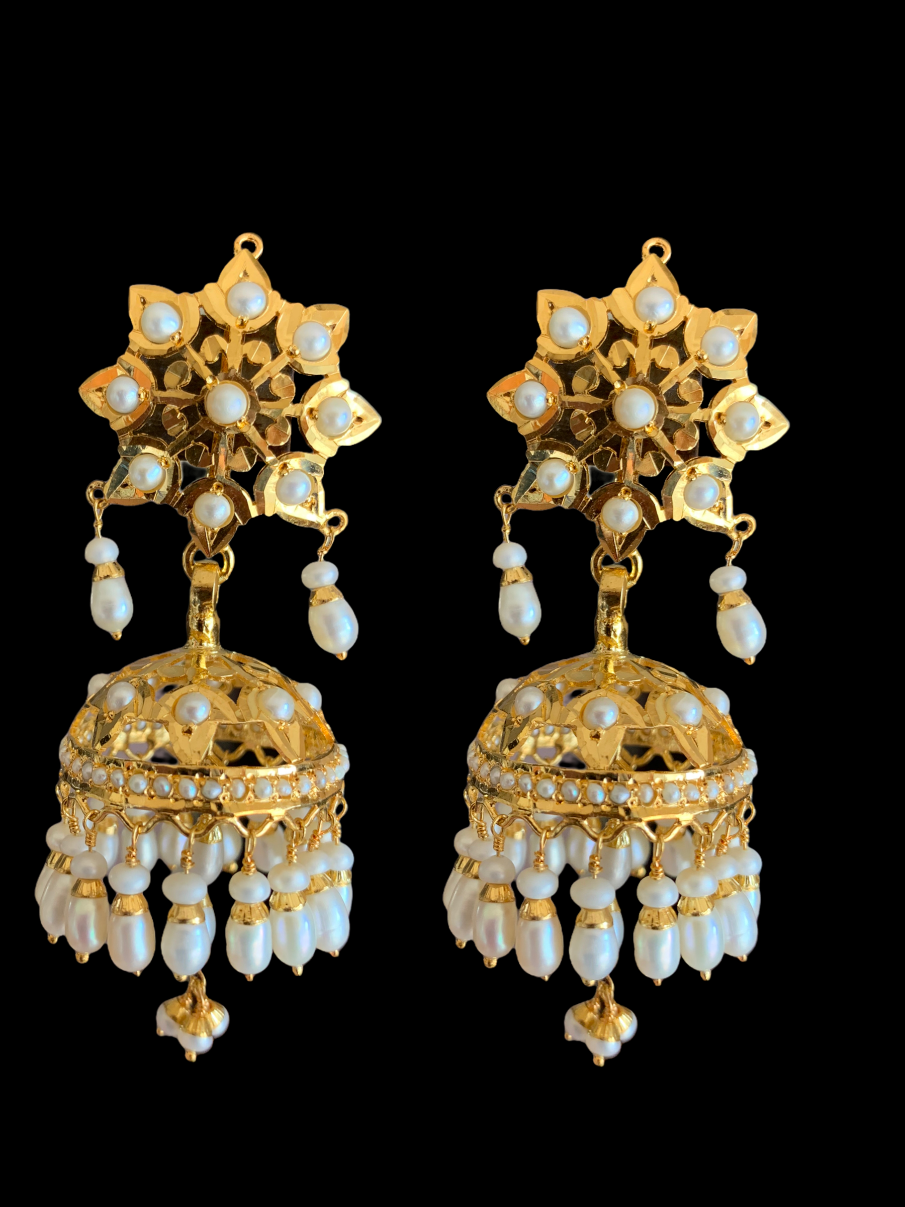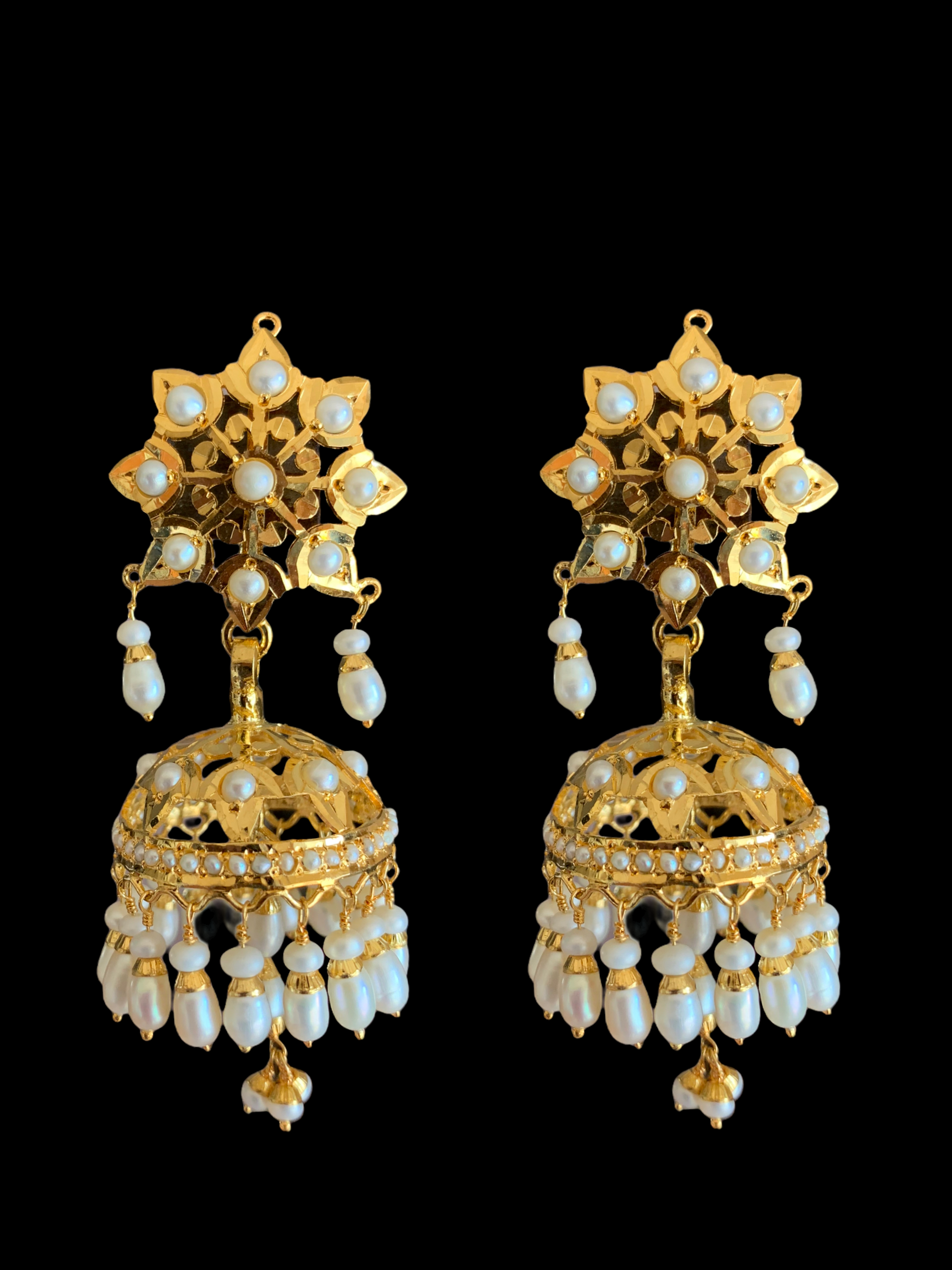 Gold plated silver jadavi choker with jhumka in fresh water pearls ( SHIPS IN 5 WEEKS )