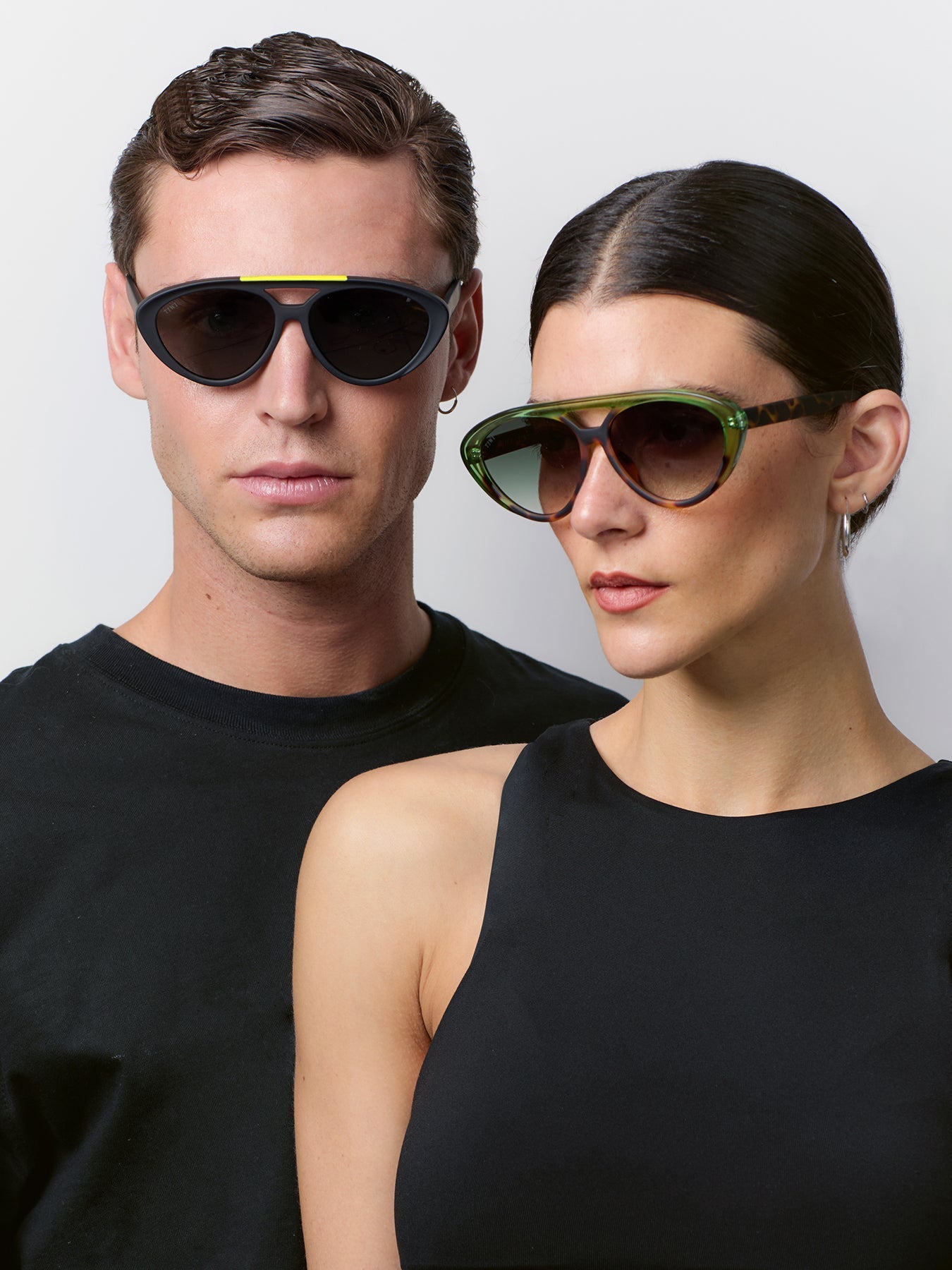 KABUKKI, a model of glasses inspired by retro aesthetics that pays homage to the iconic 80s. This design, with its Terry Richardson-style aviator silhouette, is positioned as the star accessory of the season.