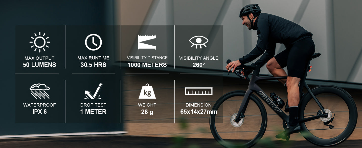 - Ultra-Bright Rear Bike Light 50 Lumens: Optillumin lens helps provide maximum 50 lumens light output, compact design, the bicycle rear light incorporates a high-transparency optical strip capable of emitting a vivid 50 lumens to bolster your visibility and safety