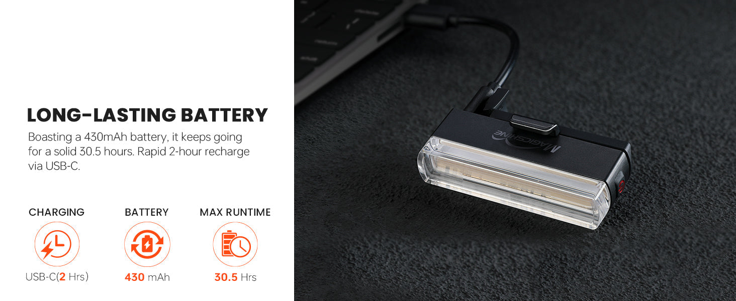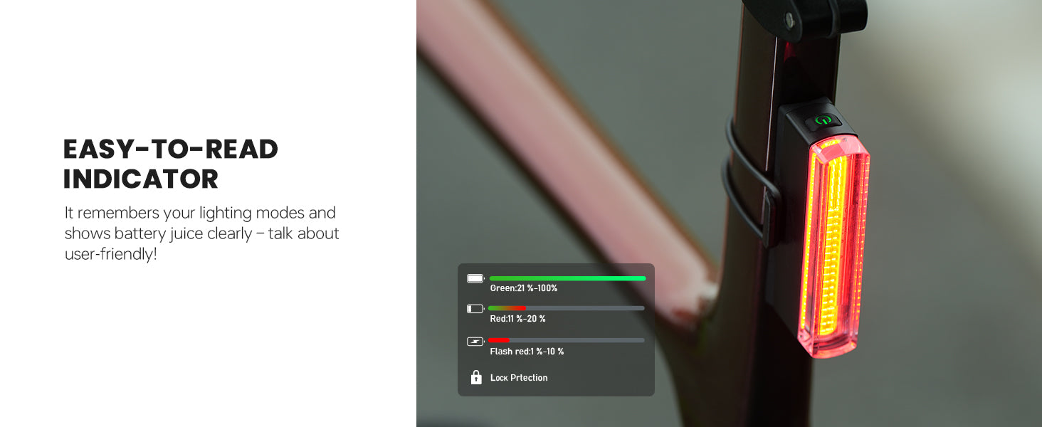 - USB-C Long-Lasting Battery: The smart bike tail light equipped with 430mAh battery, bike tail light rechargeable, keeps going for a solid 30.5 hours. A lock feature to stop accidental turns-on, saving your battery long lasting time. Memory function mode, easy-to-read battery indicator, 5 light modes and USB-C rechargeable to use friendly