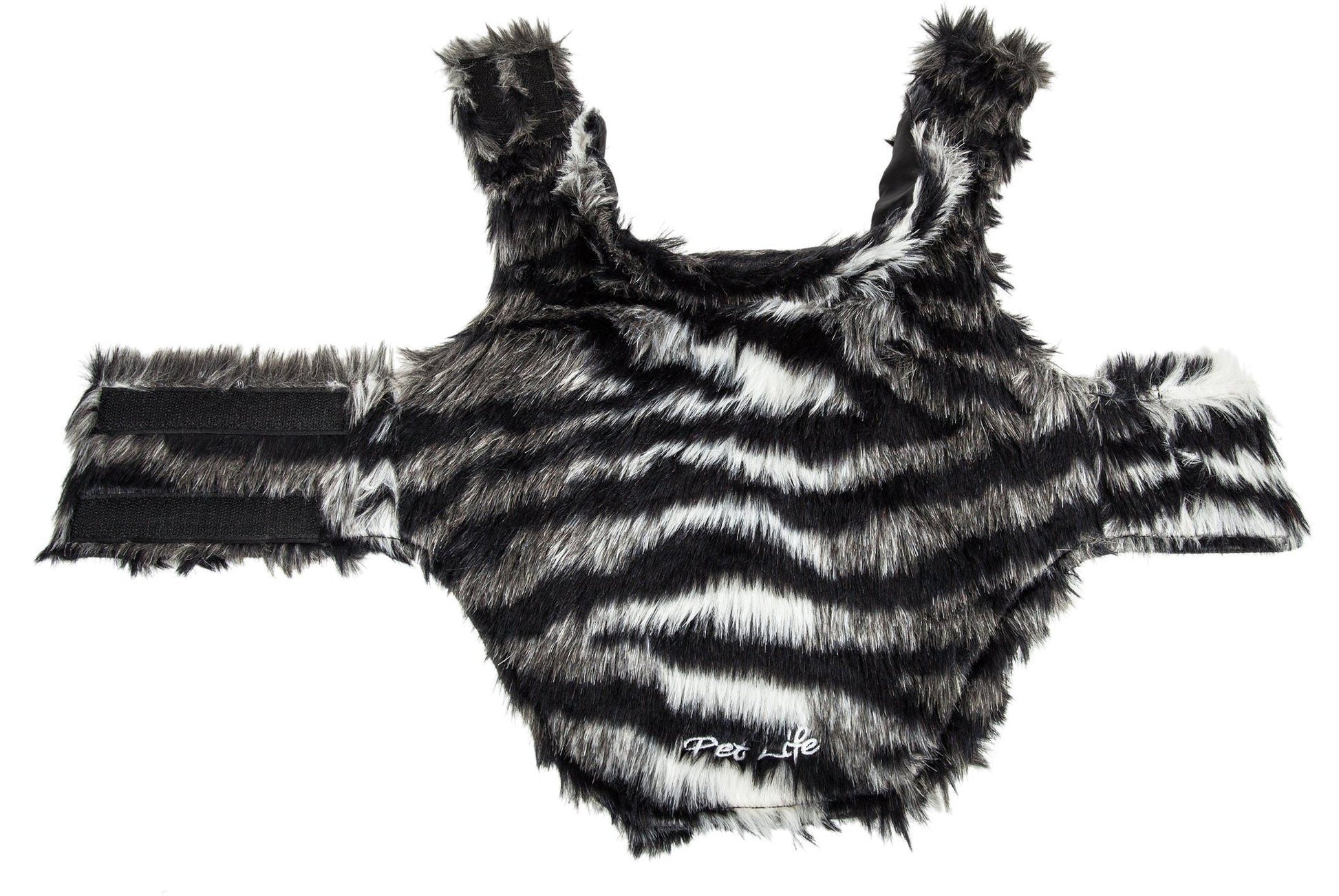 The Pet Life ® Luxe 'Chauffurry' Zebra Patterned Designer Mink Fur Dog Coat features an extravagant Dark-Gray-Toned Zebra Pattern with a richer darker shade of coloration that's loud yet subtle. Features a lavish faux-fur hood that blends together so effortlessly. The body feels ultra soft and silky-smooth while the Faux-Fur collar is soft and feathery. This zebra fur dog coat features Tough-Grade Hook-and-Loop belly closures for convenient on and off access and a leash slit below the Neck line. This luxury dog coat is part of our Pet Life ® Luxury collection. Available in Multiple Sizes.