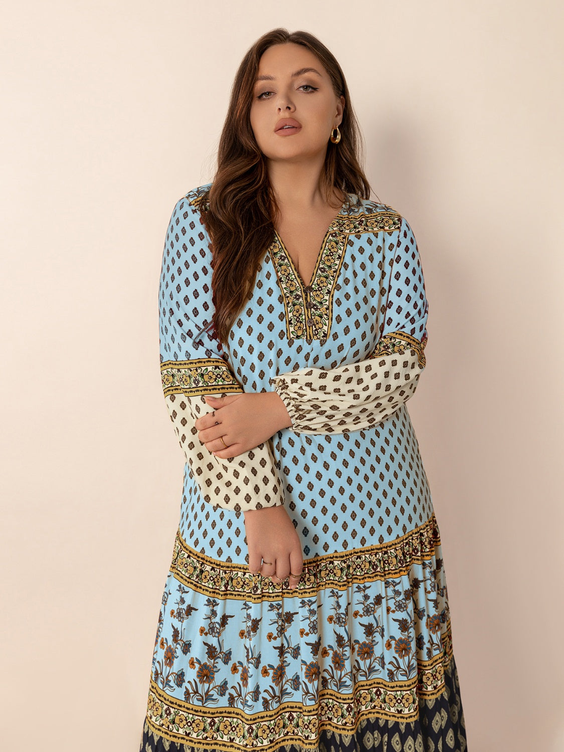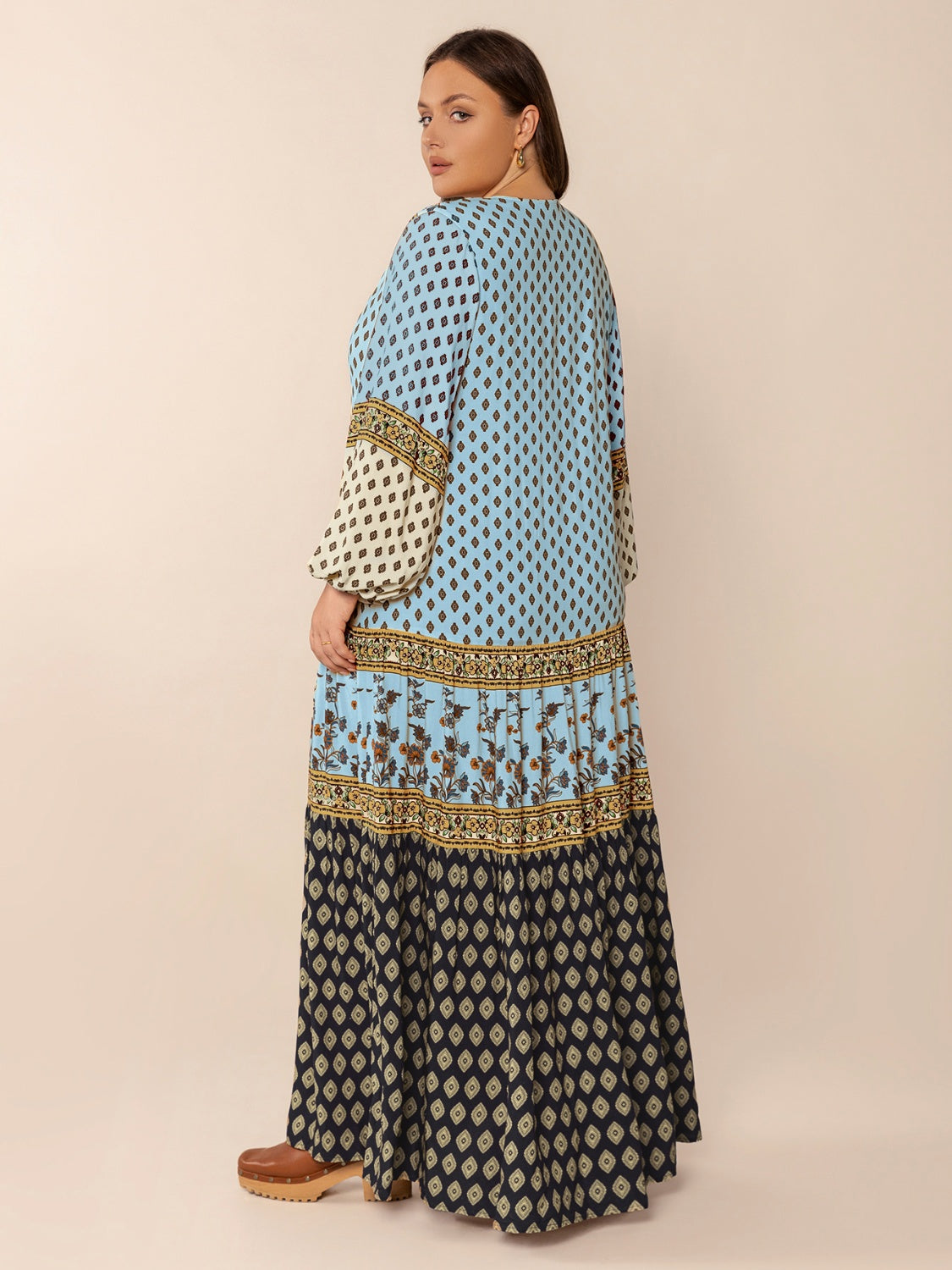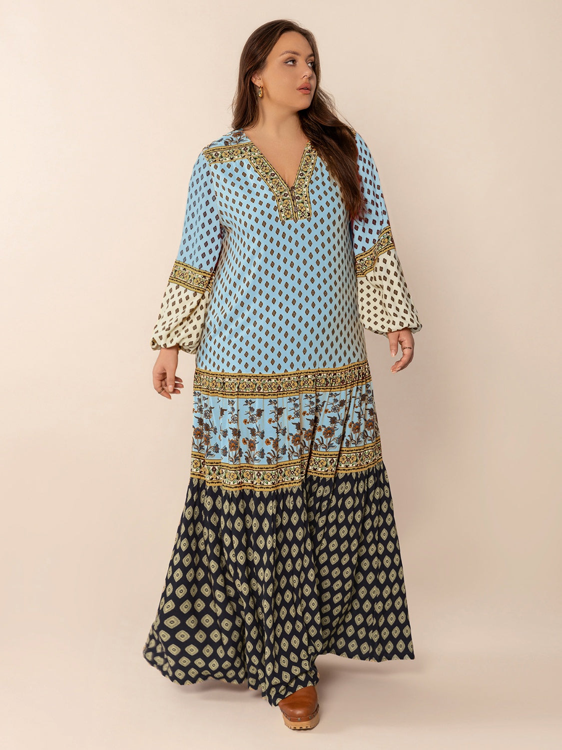 Plus Size Printed V-Neck Balloon Sleeve Maxi Dress