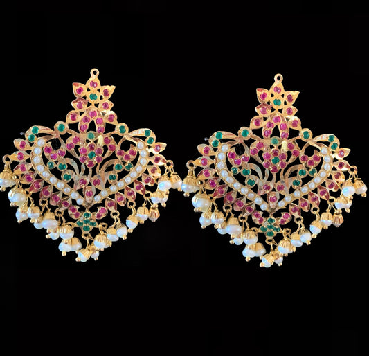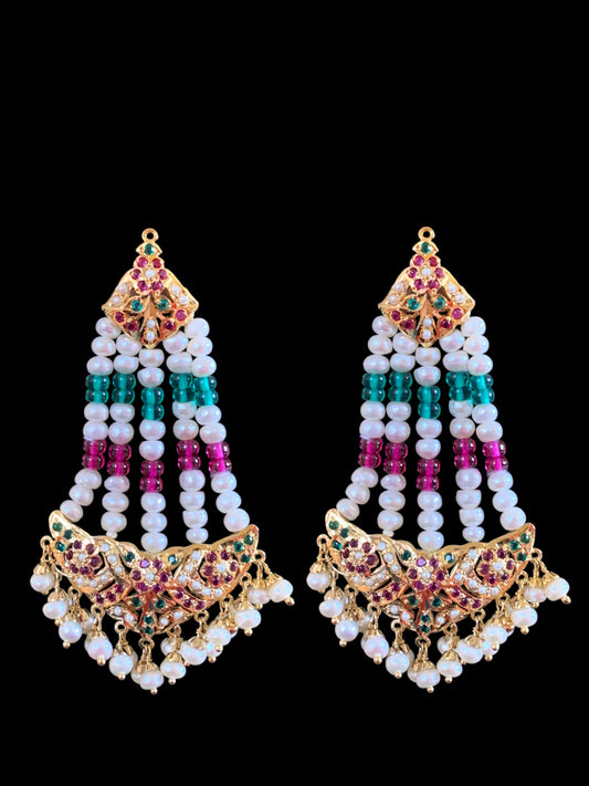 92.5 silver gold plated earrings in navratan with fresh water pearls (READY TO SHIP )