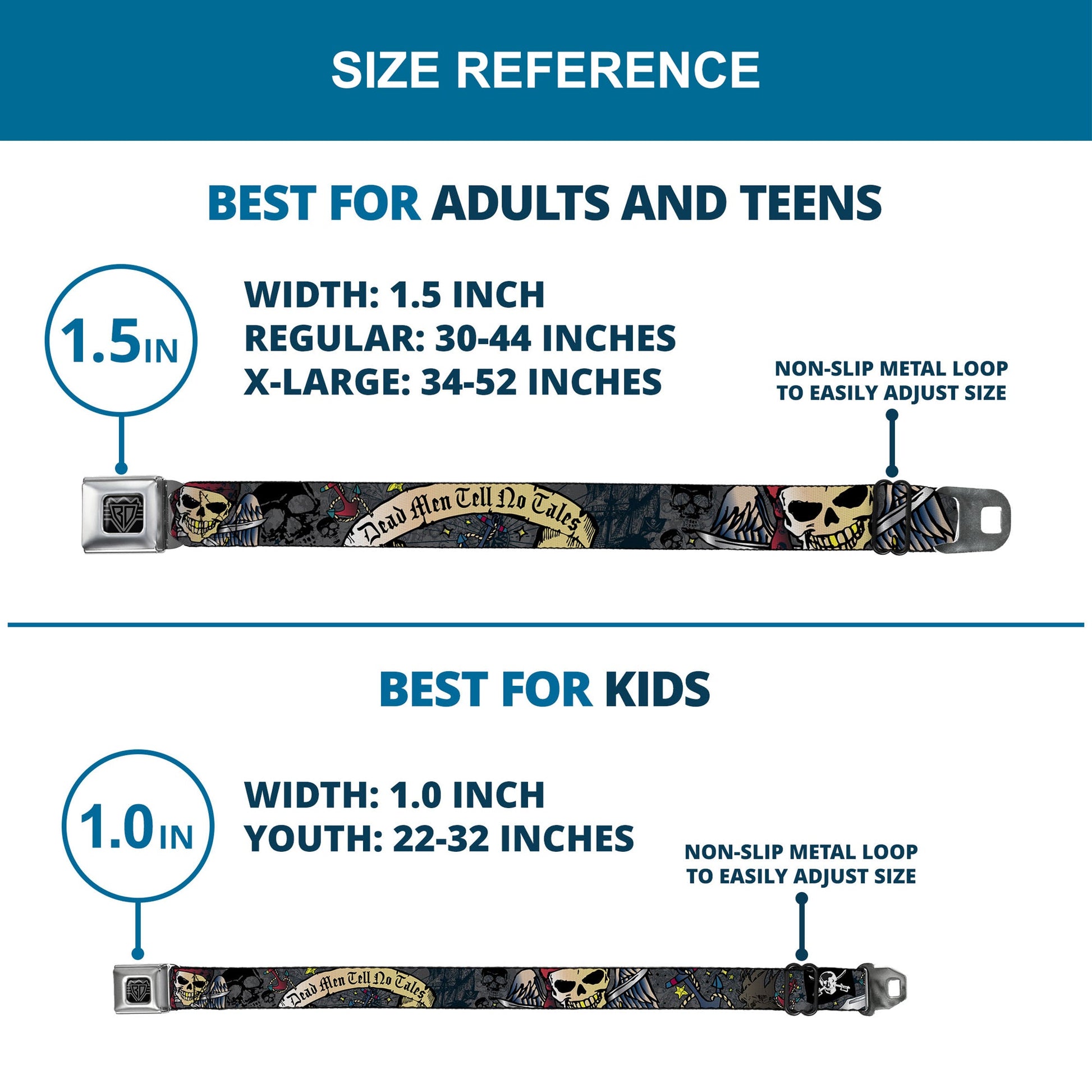 - Our adult-size Seatbelt Belts are 1.5 inches wide and our kid-sized Seatbelt Belts are 1.0 inch wide.