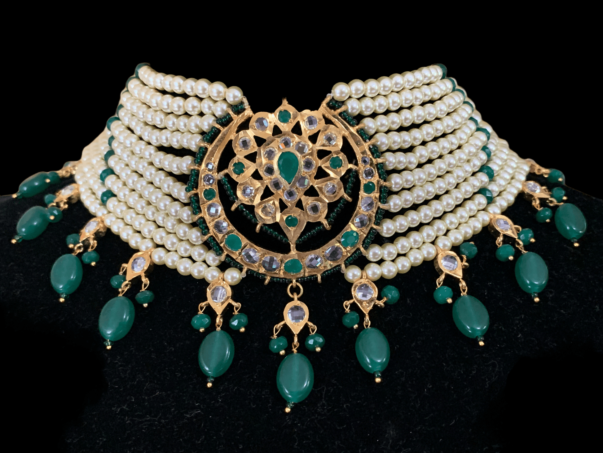C103 Noor choker set in green with golden pearls (READY TO SHIP)