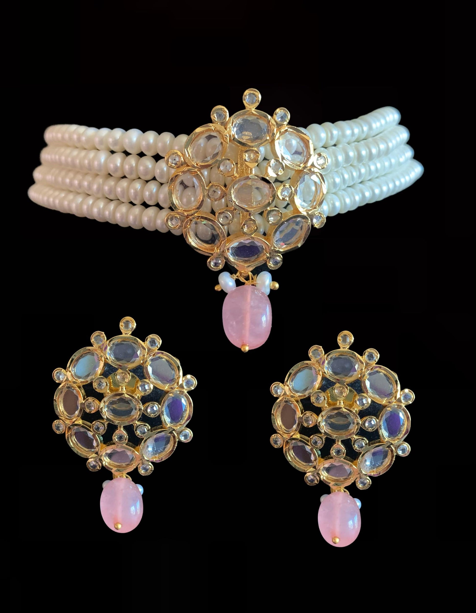 pink pearl choker, pastel choker set, freshwater pearl jewelry, CZ Polki necklace, Hyderabadi jewelry, gold-plated choker, wedding guest jewelry, Deccan Jewelry, ready to ship choker set