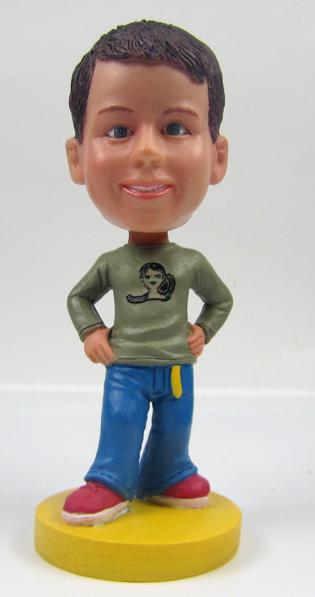 A child dressed in casual clothing. He is wearing a green shirt with a pair of jeans.