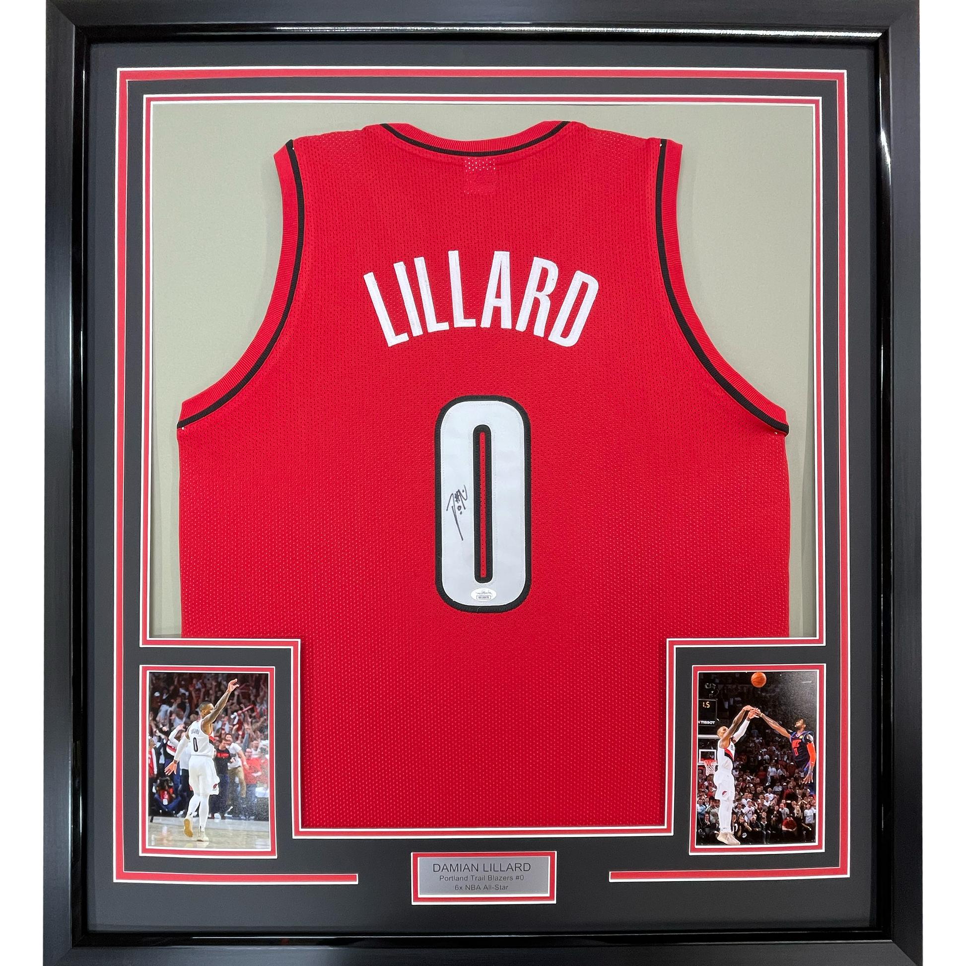 Framed Autographed/Signed Damian Lillard 35x39 Portland Red Basketball Jersey JSA COA