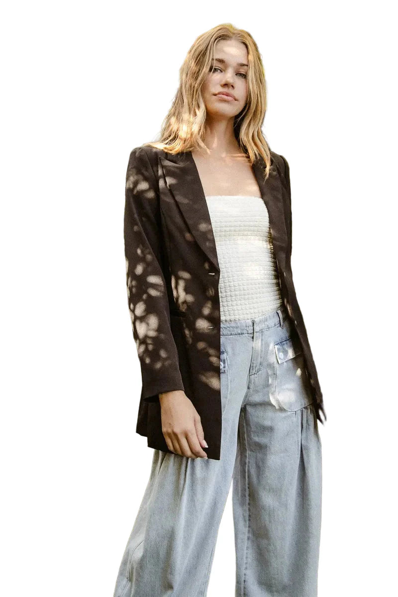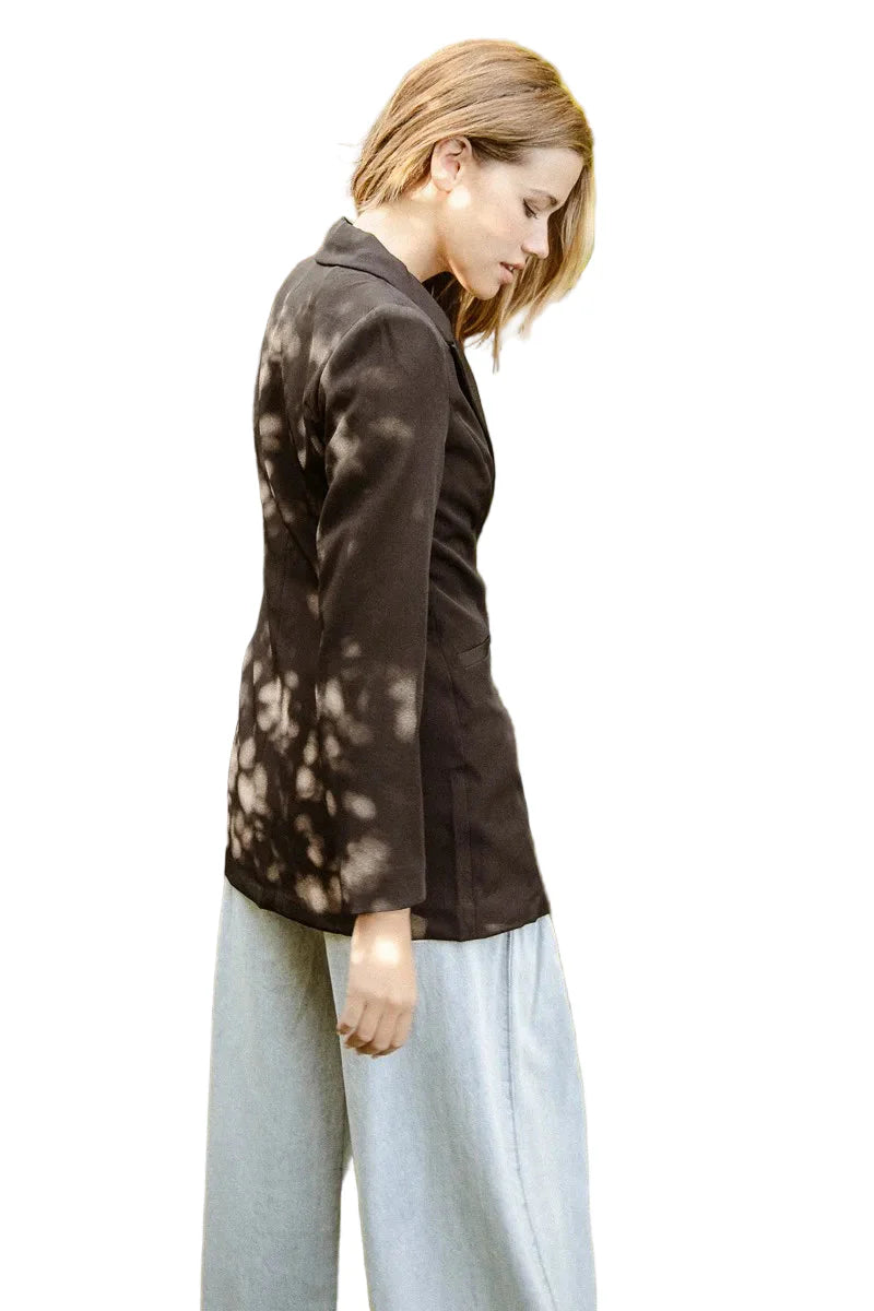 Embrace the allure of sophistication with our Single Breasted Peaked Lapel Blazer. This exquisite piece drapes gracefully over your silhouette, whispering elegance with every movement. The peaked lapels frame your face, inviting admiration and intrigue.