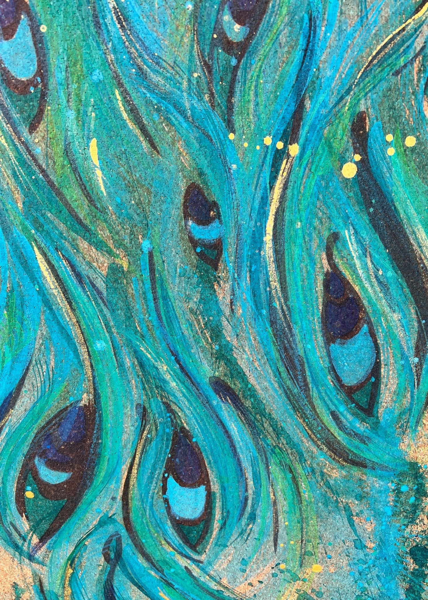 Awaken your inner Goddess with graceful flow. This design was born from my own love of the Peacock and their beautiful iridescent colors. I am awe inspired by Mother Nature’s color creating ability, as an artist, I enjoy the challenge of capturing and recreating from the natural world in an abstracted style.