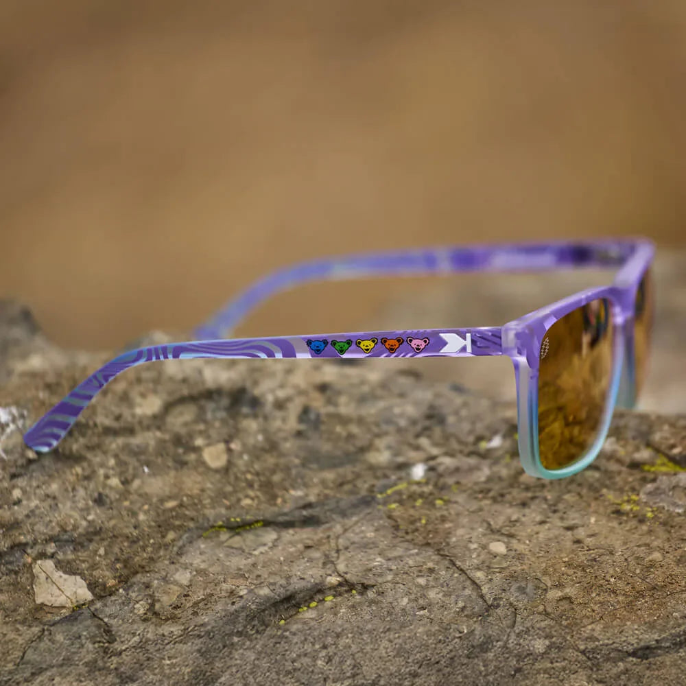 Step into a technicolor daydream with the Trippy Bears Fast Lanes! These shades swirl together frosted light blue and purple in a wavy pattern that’s pure visual bliss. Featuring the Grateful Dead’s iconic Dancing Bear heads along the arms, they’re a festival-ready trip down memory lane. Whether you’re chasing the music or just soaking up the sun, these shades will have you feeling far-out and fabulous wherever the groove takes you.