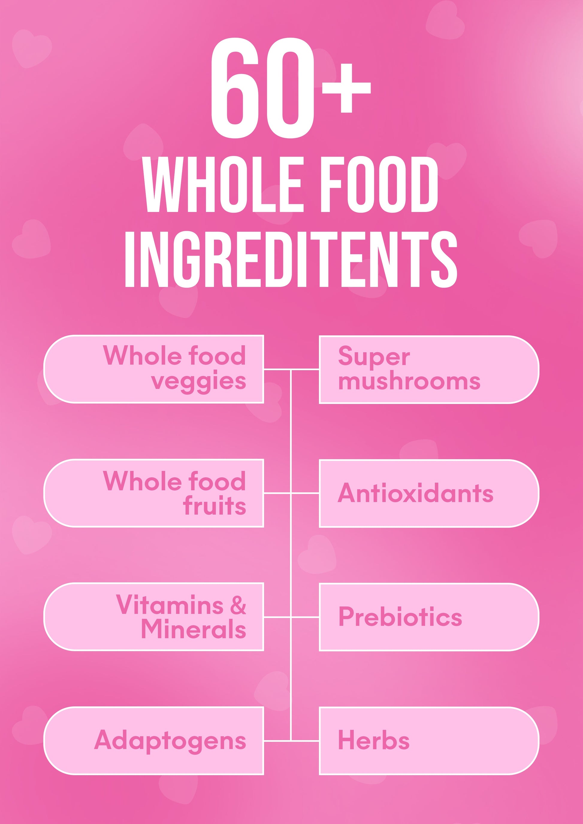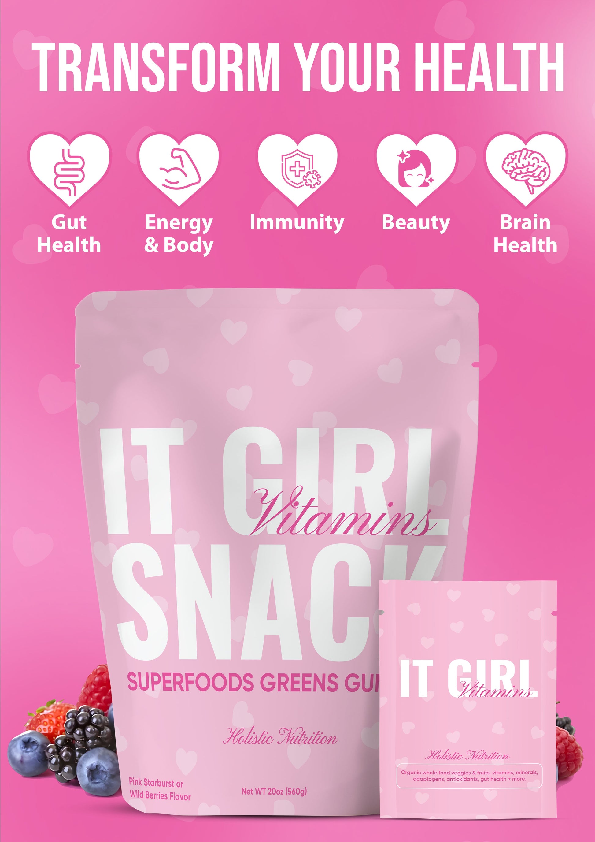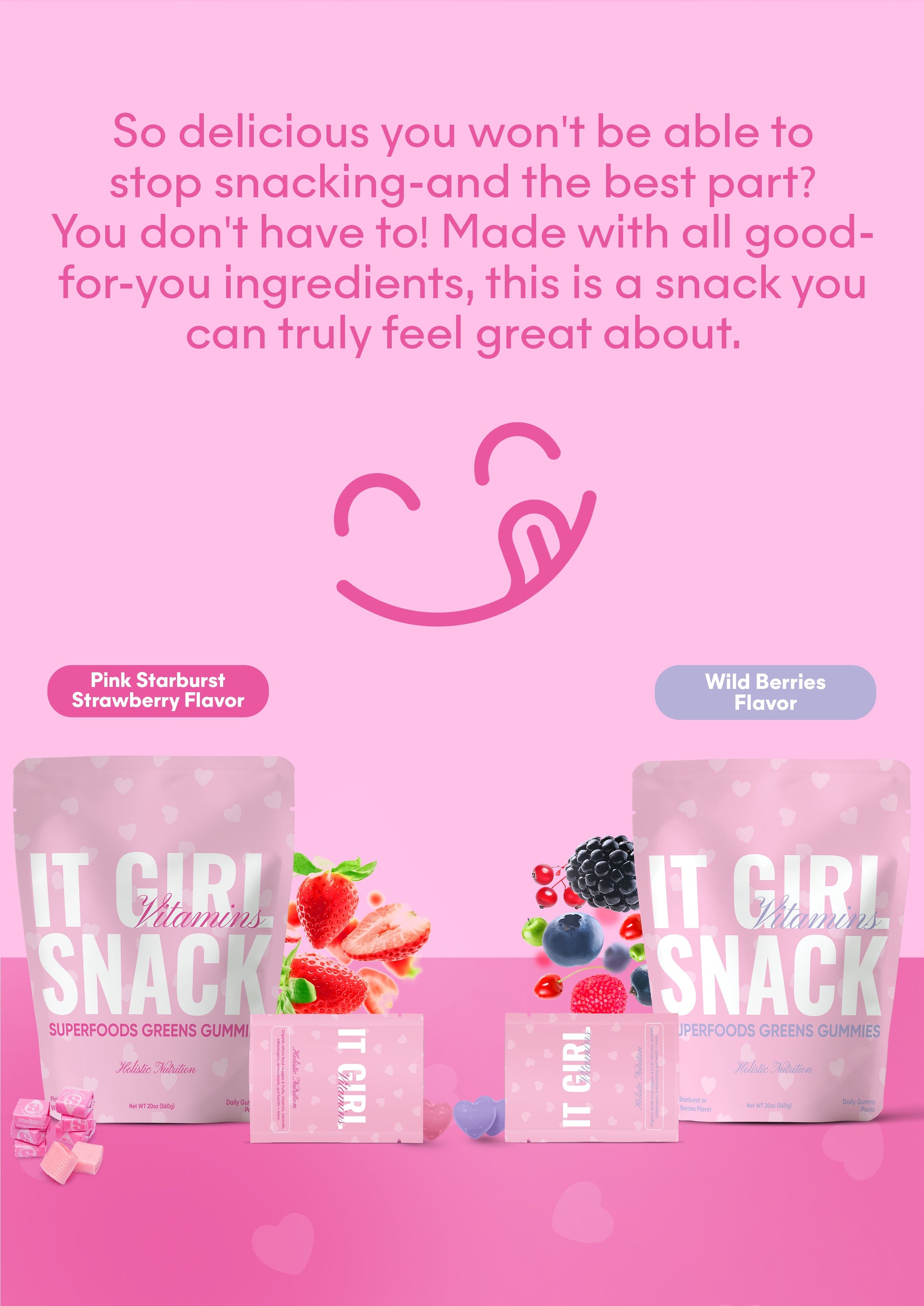 A delicious daily gummy that tastes like a Pink Starburst and supports your wellness from the inside out. It Girl Snack is a heart-shaped superfood gummy packed with over 60 plant-based ingredients including fruits, vegetables, vitamins, minerals, and greens.