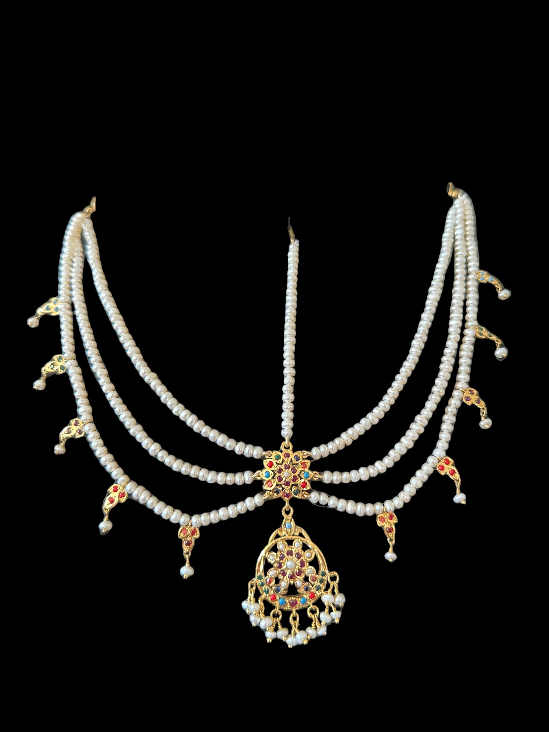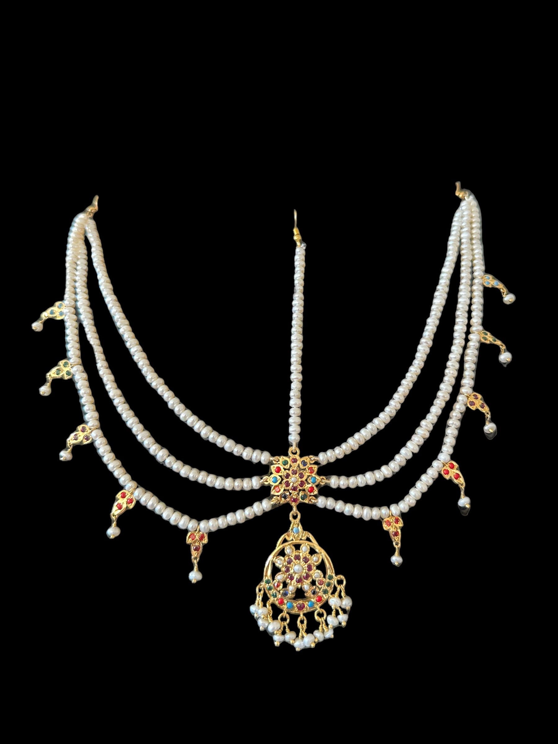 Navratan gold plated silver mathapatti in fresh water pearls ( READY TO SHIP )