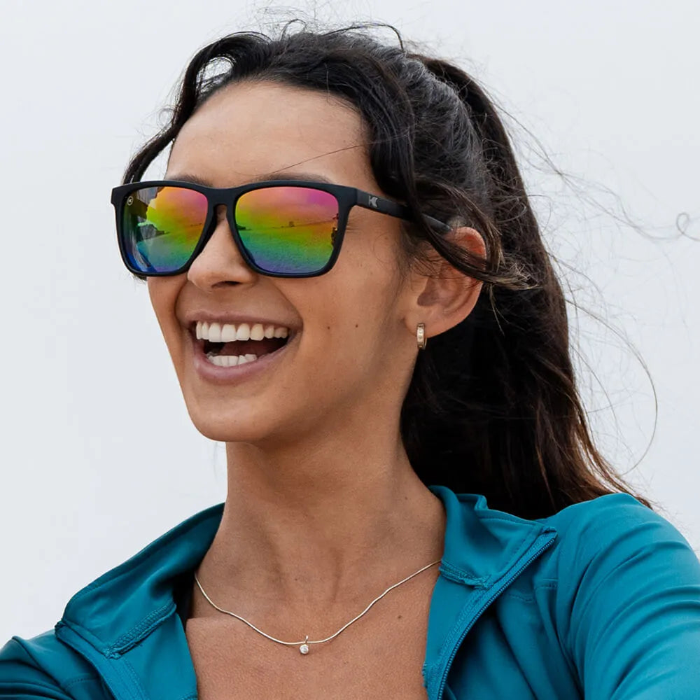 Built for dashing speed and effortless style, our Rainbow on Black Fast Lanes Sport sunglasses are here to shine bright. All those far flung adventures ahead of you won’t know what hit them thanks to the perfect combination of fierce and refined. Sleek matte black frames are accented with subtle gunmetal K logos. Vivid polarized rainbow lenses, complete with full UV400 protection, are here to stay no matter how far off road those auspicious day trips take you. Pics or it didn’t happen.