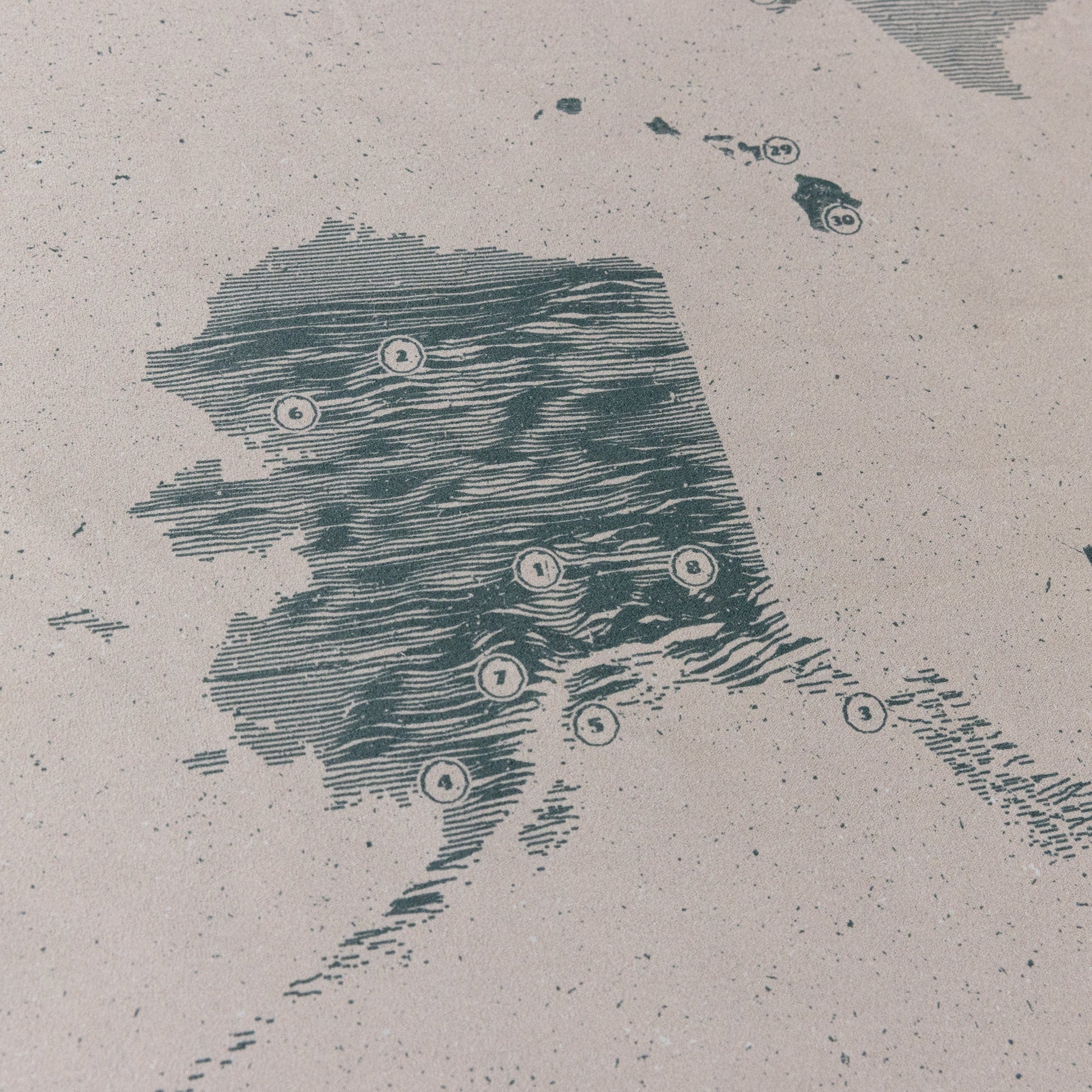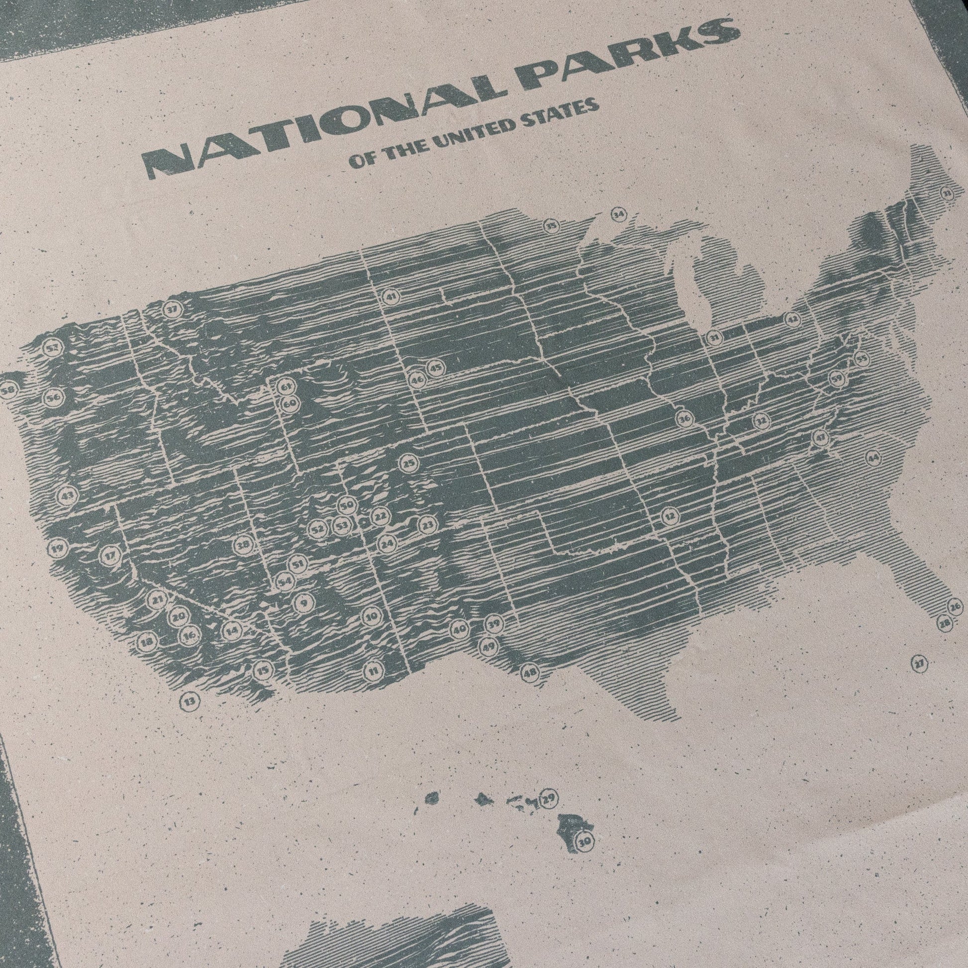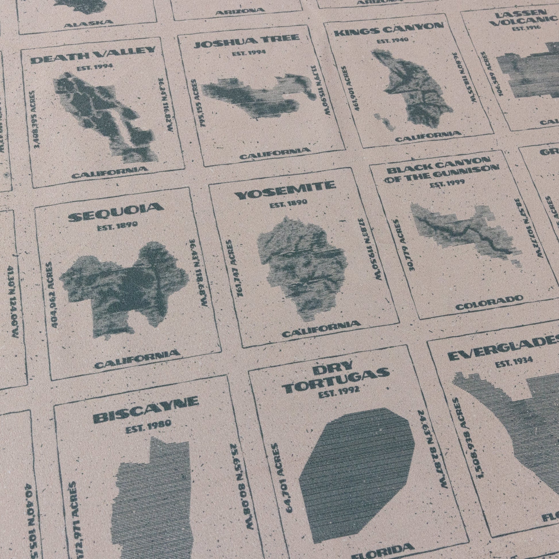 Inspired by the US National Parks, this vintage design features a map of the parks on the front and displays each park’s acreage, shape, and year of founding on the back.
