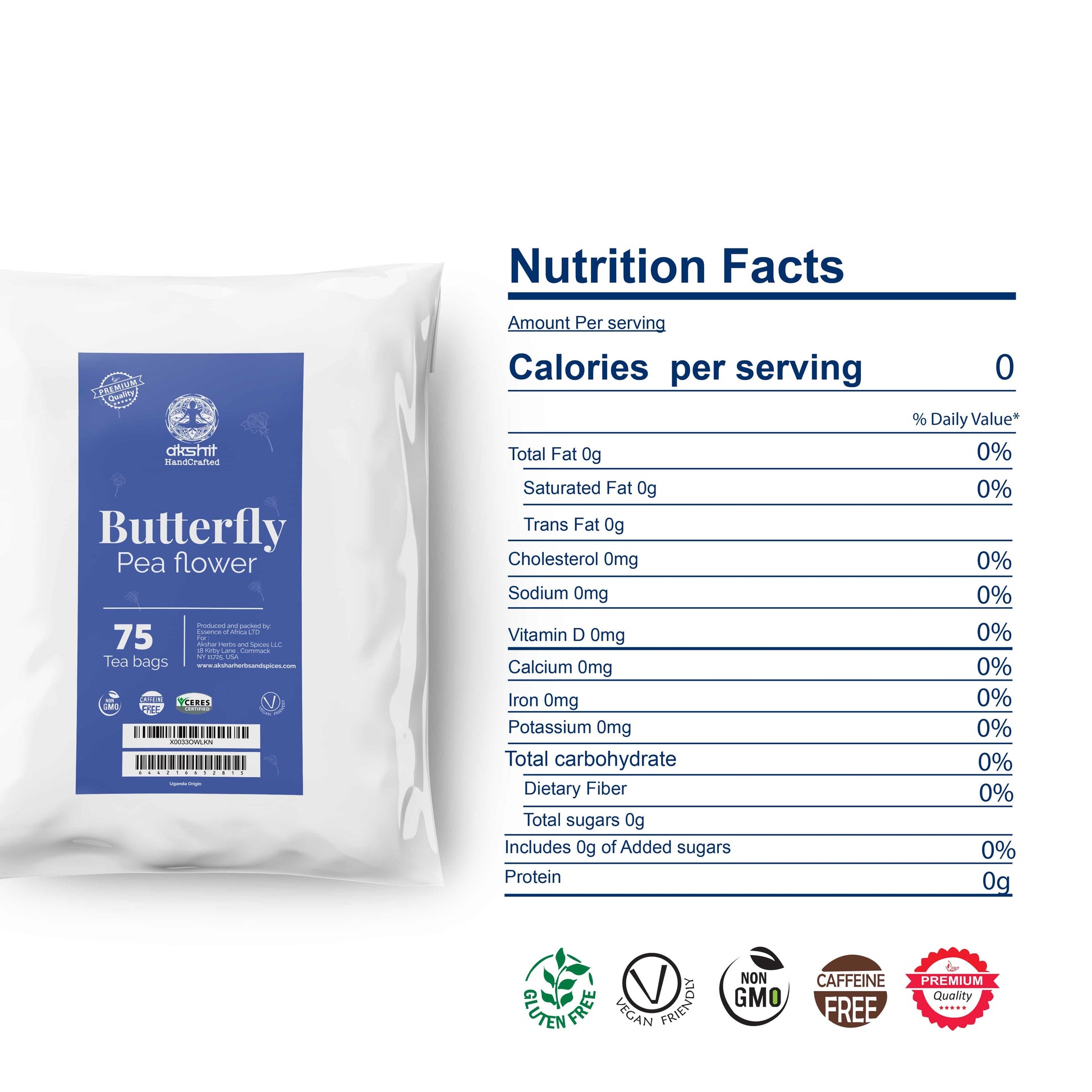 Akshit Butterfly Pea Flower ( Blue Tea ) - 75 Tea Bags, Natural Dried Butterfly Pea Flowers, Caffeine-Free, NON-GMO