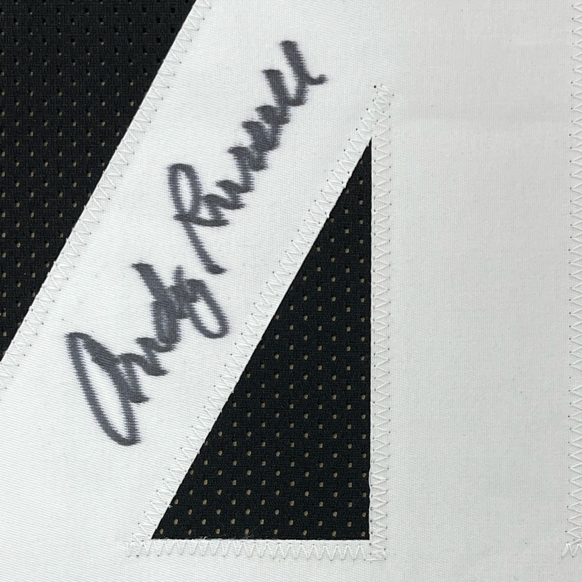 Framed Autographed/Signed Andy Russell 2x Super Bowl Champs 35x39 Pittsburgh Black Football Jersey JSA COA