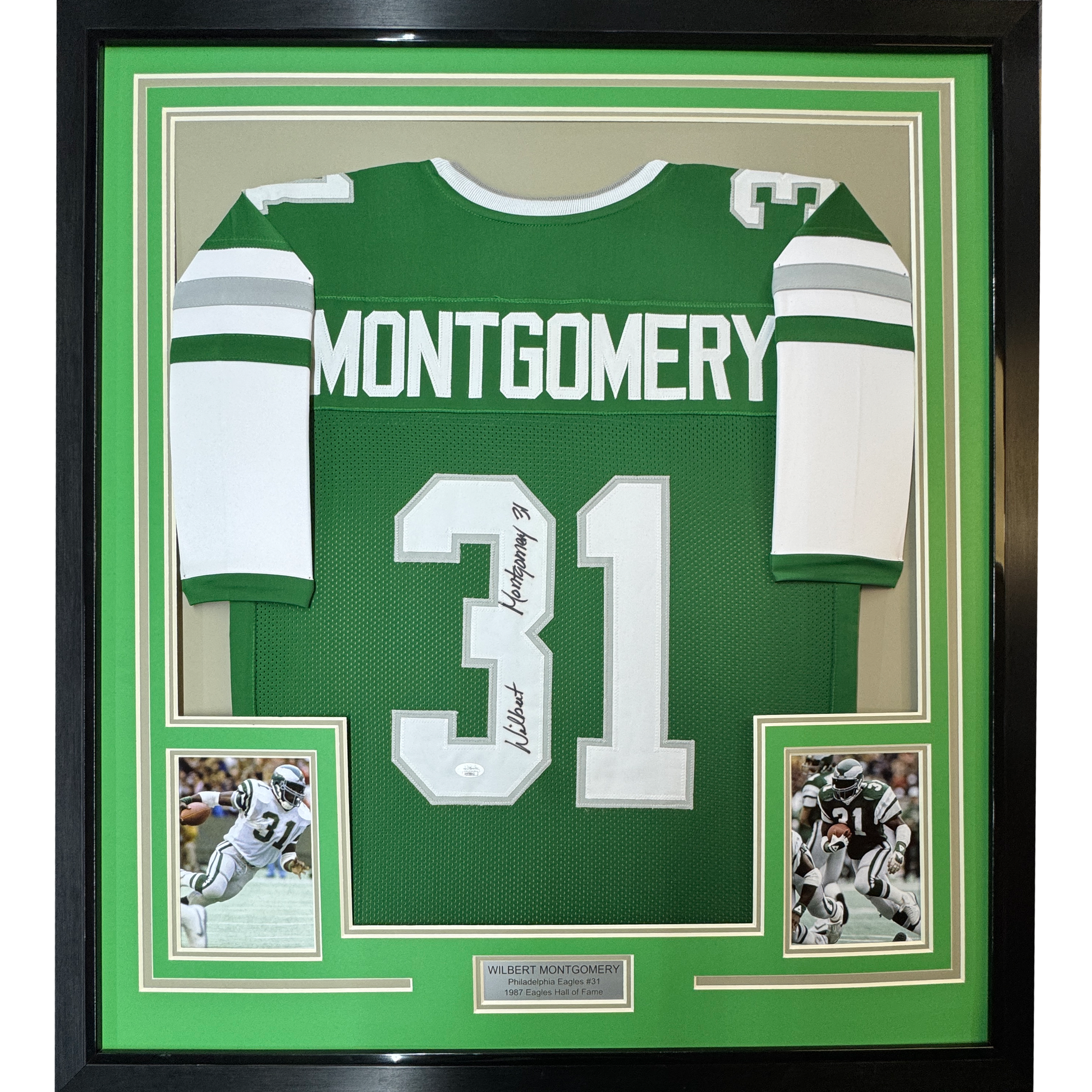 Framed Autographed/Signed Wilbert Montgomery 35x39 Philadelphia Green Football Jersey JSA COA