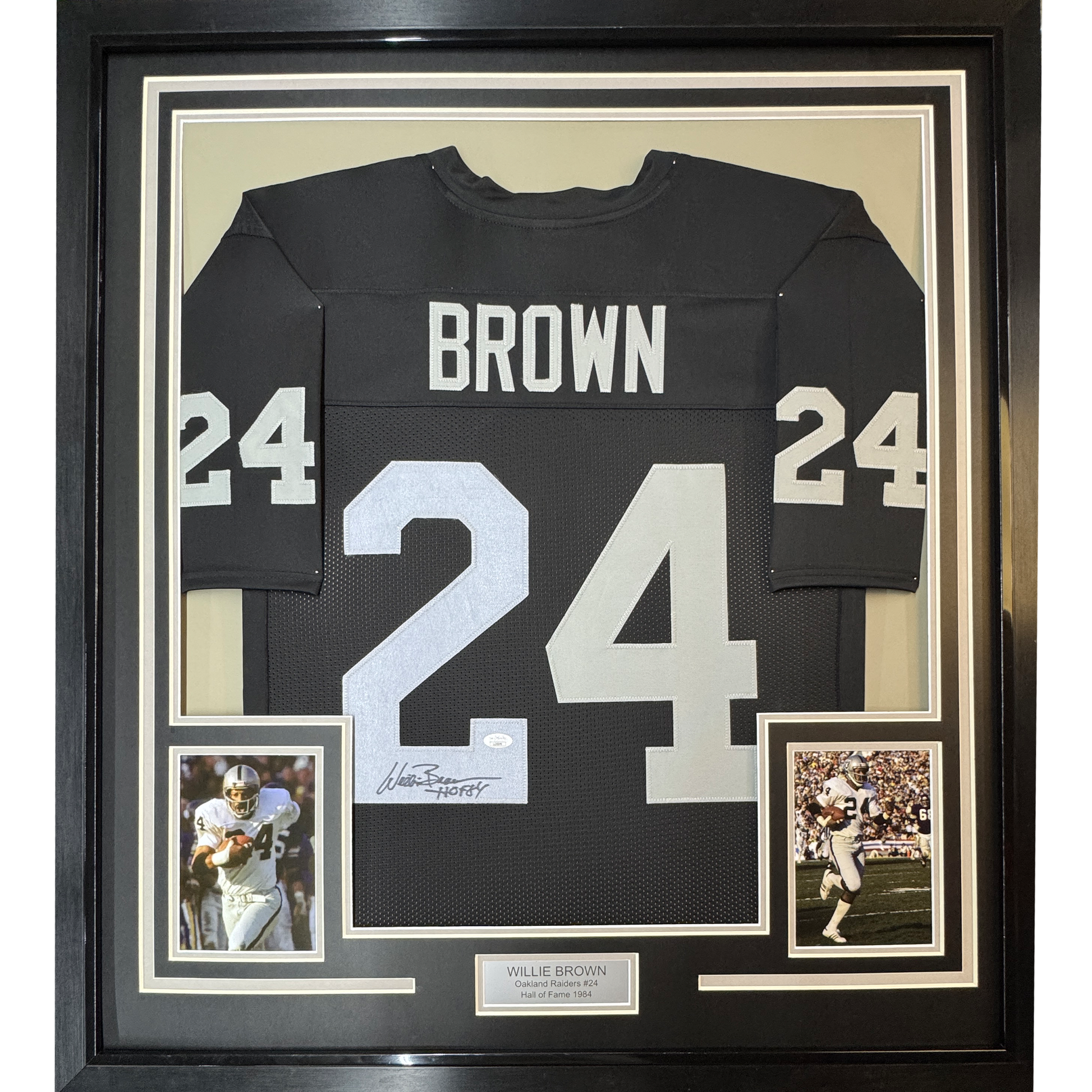 Framed Autographed/Signed Willie Brown 35x39 HOF 84 Las Vegas Oakland Black Football Jersey JSA COA
