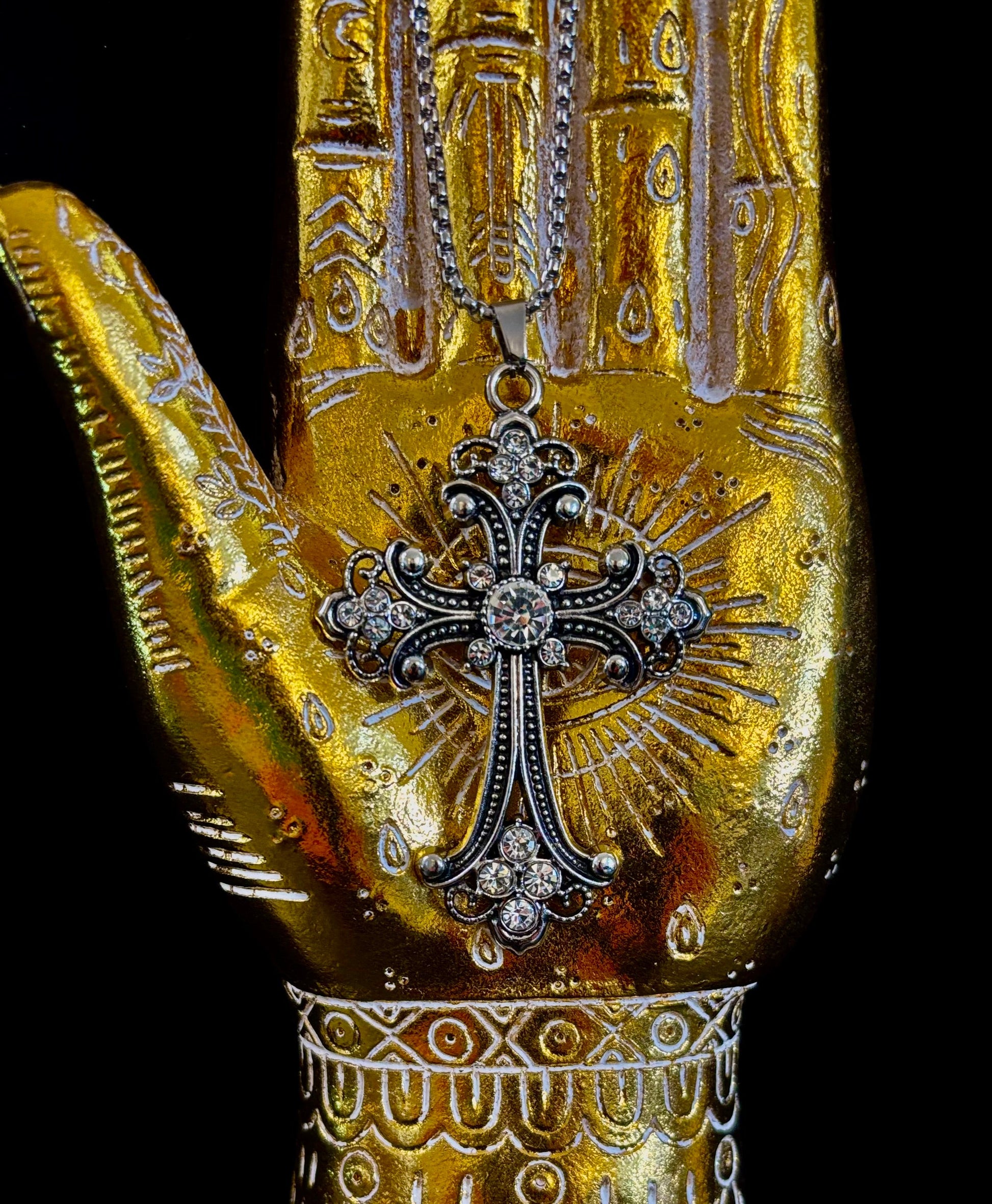 Elevate your look with timeless elegance and spiritual symbolism in our Vintage Crystal Cross Pendant Necklace. This beautifully detailed silver-tone cross features intricate scrollwork and shimmering rhinestone accents, offering a bold yet refined statement of faith and fashion.