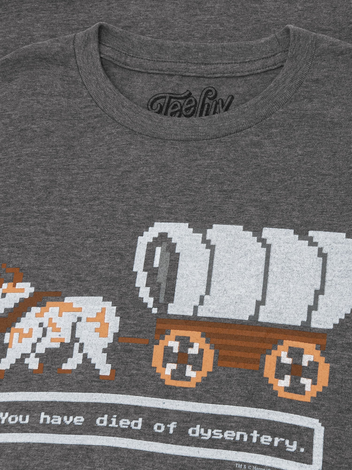 We've selected a pixel-styled graphic of the ox-drawn wagon from the game, along with the classic "You Have Died of Dysentery" message for this retro tee. To complete the vintage look and feel of this Oregon Trail shirt - we've printed the design on a soft, Heather Graphite tee.