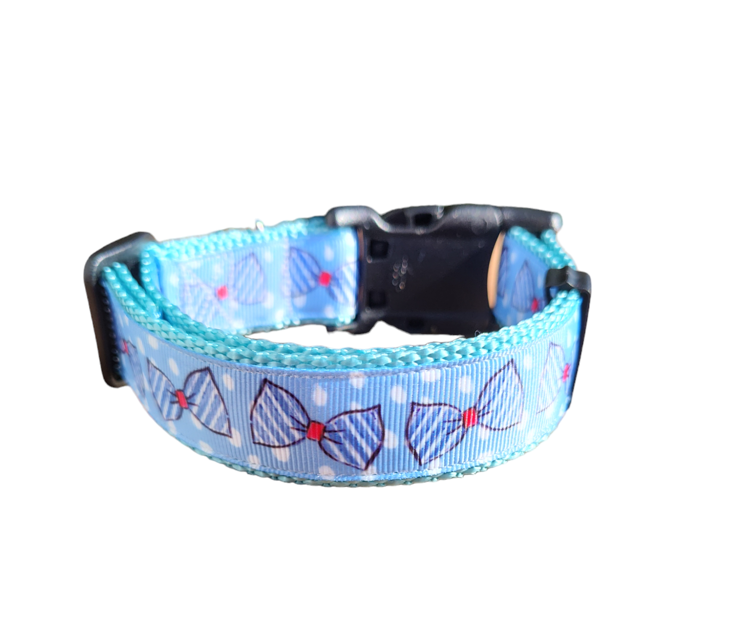 Blue Bow Ties dog collar on light blue nylon webbing