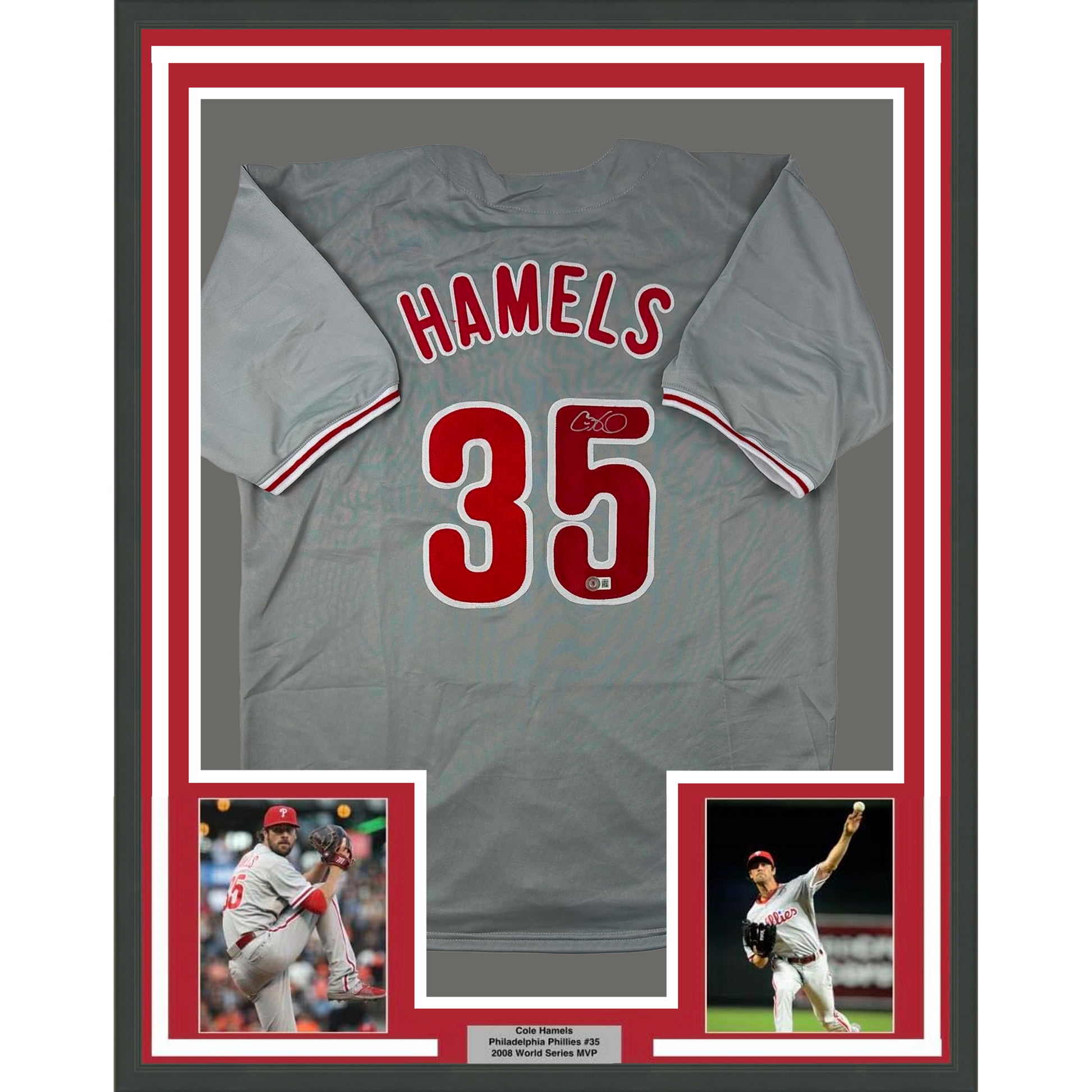 Framed Autographed/Signed Cole Hamels 35x39 Philadelphia Grey Baseball Jersey Beckett BAS COA
